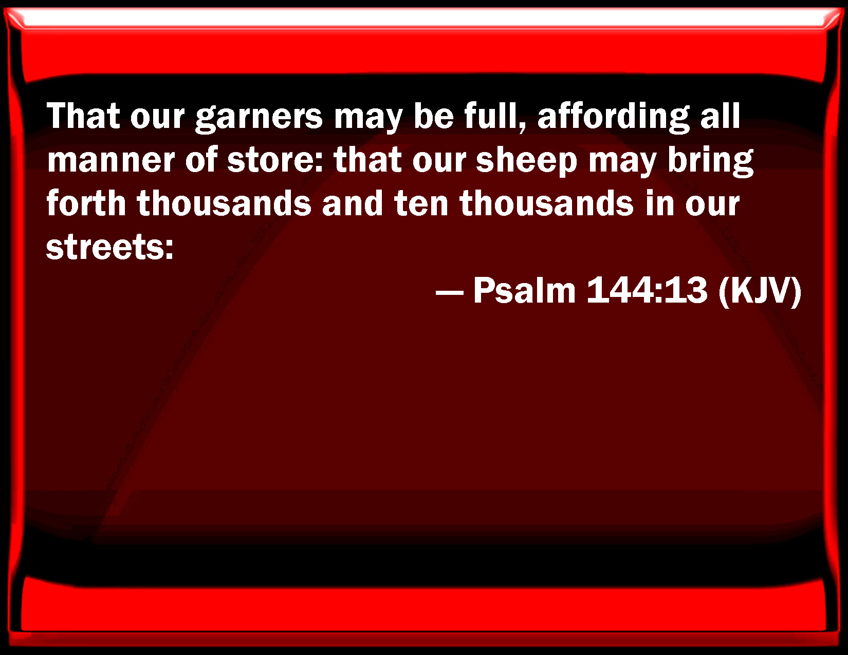 Bible Verse Slide Psalm 144:13 That our garners may be full, affording all manner of store: that our sheep may bring forth thousands and ten thousands in our streets: KJV: That our garners may be full, affording all manner of store: that our sheep may bring forth thousands and ten thousands in our streets: DRB: Their storehouses full, flowing out of this into that. Their sheep fruitful in young, abounding in their goings forth: DBT: Our granaries full, affording all manner of store; our sheep bringing forth thousands, ten thousands in our pastures; ERV: When our garners are full, affording all manner of store; and our sheep bring forth thousands and ten thousands in our fields; WBT: That our granaries may be full, affording all manner of store; that our sheep may bring forth thousands and ten thousands in our streets: WEB: Our barns are full, filled with all kinds of provision. Our sheep bring forth thousands and ten thousands in our fields. YLT: Our garners are full, bringing out from kind to kind, Our flocks are bringing forth thousands, Ten thousands in our out-places,Links Psalm 144:13 NIV • Psalm 144:13 NLT • Psalm 144:13 ESV • Psalm 144:13 NASB • Psalm 144:13 KJV • Psalm 144:13 Interlinear • Psalm 144:13 Commentaries • Psalm 144:13 Parallel Texts • Psalm 144:13 Bible Apps • Psalm 144:13 Parallel • Bible Hub |