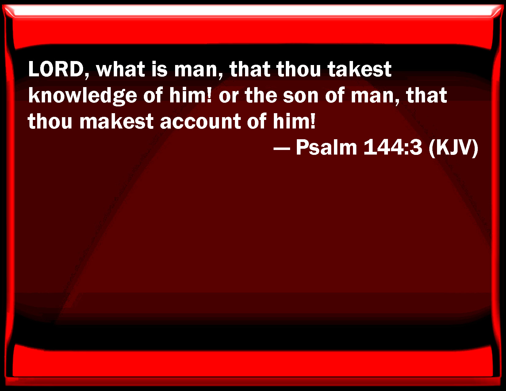 Bible Verse Slide Psalm 144:3 LORD, what is man, that you take knowledge of him! or the son of man, that you make account of him! KJV: LORD, what is man, that thou takest knowledge of him! or the son of man, that thou makest account of him! DRB: Lord, what is man, that thou art made known to him? or the son of man, that thou makest account of him? DBT: Jehovah, what is man, that thou takest knowledge of him, the son of man, that thou takest thought of him? ERV: LORD, what is man, that thou takest knowledge of him? or the son of man, that thou makest account of him? WBT: LORD, what is man, that thou takest knowledge of him! or the son of man, that thou makest account of him! WEB: Yahweh, what is man, that you care for him? Or the son of man, that you think of him? YLT: Jehovah, what is man that Thou knowest him? Son of man, that Thou esteemest him?Links Psalm 144:3 NIV • Psalm 144:3 NLT • Psalm 144:3 ESV • Psalm 144:3 NASB • Psalm 144:3 KJV • Psalm 144:3 Interlinear • Psalm 144:3 Commentaries • Psalm 144:3 Parallel Texts • Psalm 144:3 Bible Apps • Psalm 144:3 Parallel • Bible Hub |