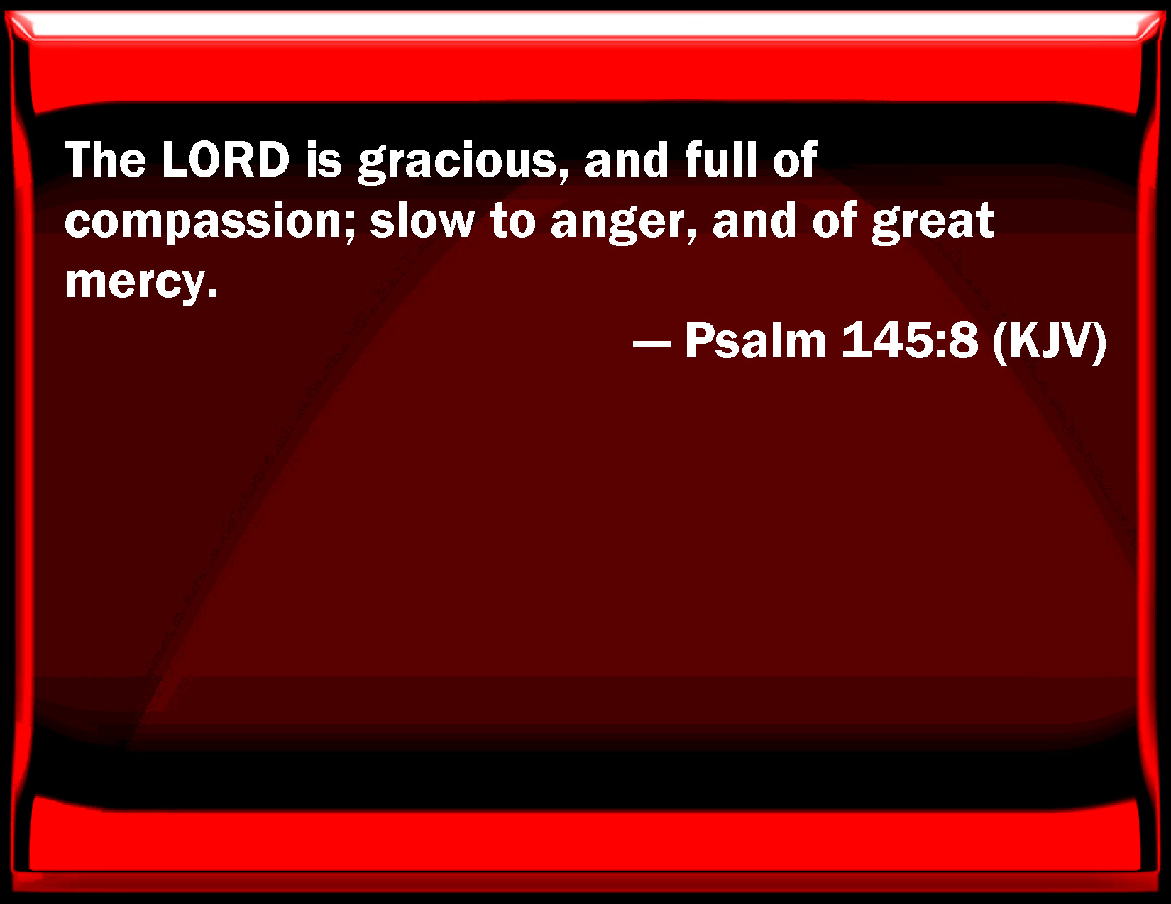 Bible Verse Slide Psalm 145:8 The LORD is gracious, and full of compassion; slow to anger, and of great mercy. KJV: The LORD is gracious, and full of compassion; slow to anger, and of great mercy. DRB: The Lord is gracious and merciful: patient and plenteous in mercy. DBT: Jehovah is gracious and merciful; slow to anger, and of great loving-kindness. ERV: The LORD is gracious, and full of compassion; slow to anger, and of great mercy. WBT: The LORD is gracious, and full of compassion; slow to anger, and of great mercy. WEB: Yahweh is gracious, merciful, slow to anger, and of great loving kindness. YLT: Gracious and merciful is Jehovah, Slow to anger, and great in kindness.Links Psalm 145:8 NIV • Psalm 145:8 NLT • Psalm 145:8 ESV • Psalm 145:8 NASB • Psalm 145:8 KJV • Psalm 145:8 Interlinear • Psalm 145:8 Commentaries • Psalm 145:8 Parallel Texts • Psalm 145:8 Bible Apps • Psalm 145:8 Parallel • Bible Hub |