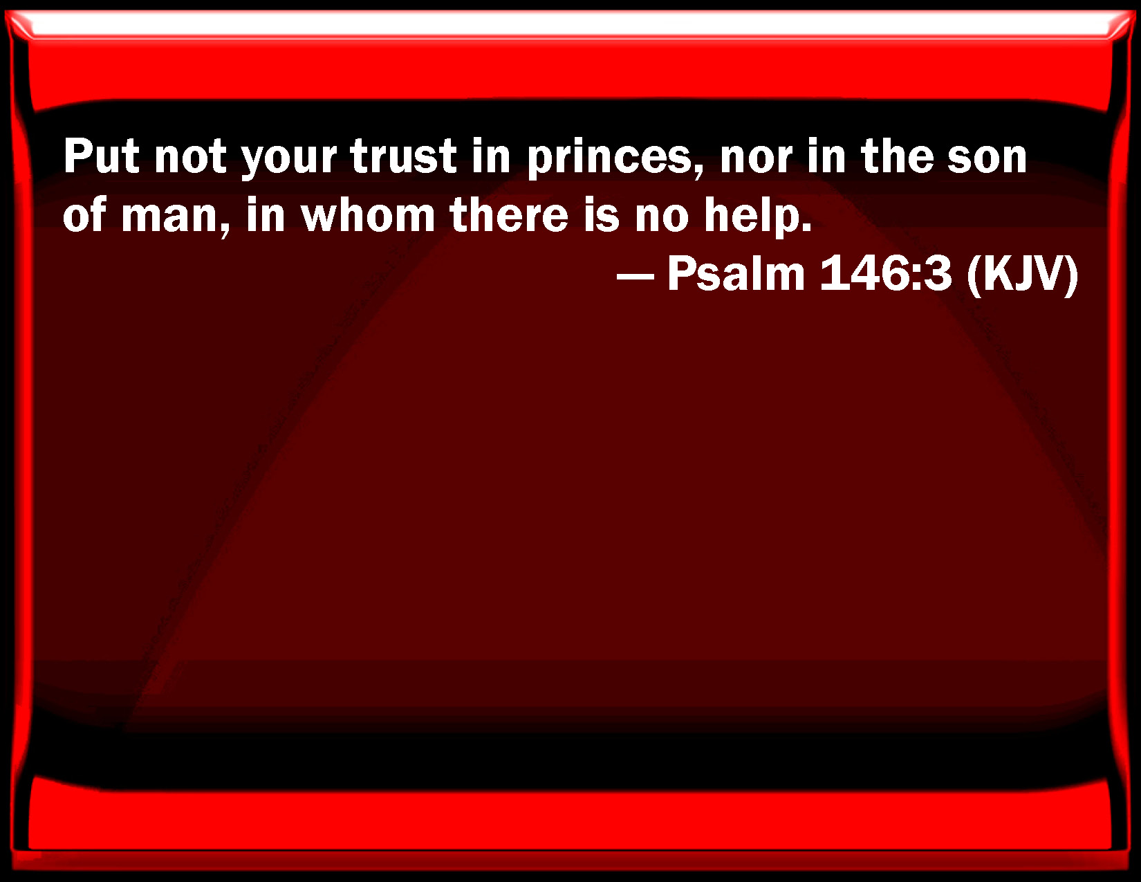 Bible Verse Slide Psalm 146:3 Put not your trust in princes, nor in the son of man, in whom there is no help. KJV: Put not your trust in princes, nor in the son of man, in whom there is no help. DRB: in the children of men, in whom there is no salvation. DBT: Put not confidence in nobles, in a son of man, in whom there is no salvation. ERV: Put not your trust in princes, nor in the son of man, in whom there is no help. WBT: Put not your trust in princes, nor in the son of man, in whom there is no help. WEB: Don't put your trust in princes, each a son of man in whom there is no help. YLT: Trust not in princes — in a son of man, For he hath no deliverance.Links Psalm 146:3 NIV • Psalm 146:3 NLT • Psalm 146:3 ESV • Psalm 146:3 NASB • Psalm 146:3 KJV • Psalm 146:3 Interlinear • Psalm 146:3 Commentaries • Psalm 146:3 Parallel Texts • Psalm 146:3 Bible Apps • Psalm 146:3 Parallel • Bible Hub |