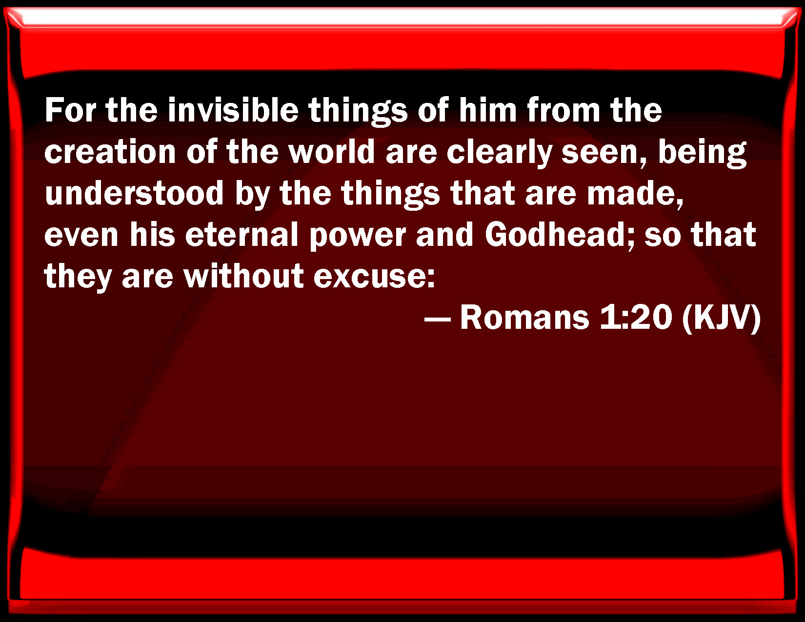 Bible Verse Slide Romans 1:20 For the invisible things of him from the creation of the world are clearly seen, being understood by the things that are made, even his eternal power and Godhead; so that they are without excuse: KJV: For the invisible things of him from the creation of the world are clearly seen, being understood by the things that are made, even his eternal power and Godhead; so that they are without excuse: DRB: For the invisible things of him, from the creation of the world, are clearly seen, being understood by the things that are made; his eternal power also, and divinity: so that they are inexcusable. DBT: for from the world's creation the invisible things of him are perceived, being apprehended by the mind through the things that are made, both his eternal power and divinity, so as to render them inexcusable. ERV: For the invisible things of him since the creation of the world are clearly seen, being perceived through the things that are made, even his everlasting power and divinity; that they may be without excuse: WBT: For the invisible things of him from the creation of the world are clearly seen, being understood by the things that are made, even his eternal power and Godhead; so that they are without excuse: WEB: For the invisible things of him since the creation of the world are clearly seen, being perceived through the things that are made, even his everlasting power and divinity; that they may be without excuse. YLT: for the invisible things of Him from the creation of the world, by the things made being understood, are plainly seen, both His eternal power and Godhead — to their being inexcusable;Links Romans 1:20 NIV • Romans 1:20 NLT • Romans 1:20 ESV • Romans 1:20 NASB • Romans 1:20 KJV • Romans 1:20 Interlinear • Romans 1:20 Commentaries • Romans 1:20 Parallel Texts • Romans 1:20 Bible Apps • Romans 1:20 Parallel • Bible Hub |