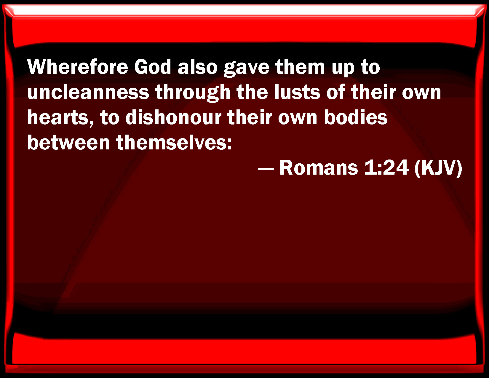 Bible Verse Slide Romans 1:24 Why God also gave them up to uncleanness through the lusts of their own hearts, to dishonor their own bodies between themselves: KJV: Wherefore God also gave them up to uncleanness through the lusts of their own hearts, to dishonour their own bodies between themselves: DRB: Wherefore God gave them up to the desires of their heart, unto uncleanness, to dishonour their own bodies among themselves. DBT: Wherefore God gave them up also in the lusts of their hearts to uncleanness, to dishonour their bodies between themselves: ERV: Wherefore God gave them up in the lusts of their hearts unto uncleanness, that their bodies should be dishonoured among themselves: WBT: Wherefore God also gave them up to uncleanness, through the lusts of their own hearts, to dishonor their own bodies between themselves: WEB: Therefore God also gave them up in the lusts of their hearts to uncleanness, that their bodies should be dishonored among themselves, YLT: Wherefore also God did give them up, in the desires of their hearts, to uncleanness, to dishonour their bodies among themselves;Links Romans 1:24 NIV • Romans 1:24 NLT • Romans 1:24 ESV • Romans 1:24 NASB • Romans 1:24 KJV • Romans 1:24 Interlinear • Romans 1:24 Commentaries • Romans 1:24 Parallel Texts • Romans 1:24 Bible Apps • Romans 1:24 Parallel • Bible Hub |