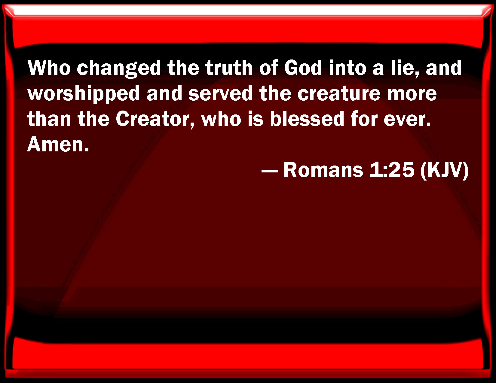 Bible Verse Slide Romans 1:25 Who changed the truth of God into a lie, and worshipped and served the creature more than the Creator, who is blessed for ever. Amen. KJV: Who changed the truth of God into a lie, and worshipped and served the creature more than the Creator, who is blessed for ever. Amen. DRB: Who changed the truth of God into a lie; and worshipped and served the creature rather than the Creator, who is blessed for ever. Amen. DBT: who changed the truth of God into falsehood, and honoured and served the creature more than him who had created it, who is blessed for ever. Amen. ERV: for that they exchanged the truth of God for a lie, and worshipped and served the creature rather than the Creator, who is blessed for ever. Amen. WBT: Who changed the truth of God into a lie, and worshiped and served the creature more than the Creator, who is blessed for ever. Amen. WEB: who exchanged the truth of God for a lie, and worshiped and served the creature rather than the Creator, who is blessed forever. Amen. YLT: who did change the truth of God into a falsehood, and did honour and serve the creature rather than the Creator, who is blessed to the ages. Amen.Links Romans 1:25 NIV • Romans 1:25 NLT • Romans 1:25 ESV • Romans 1:25 NASB • Romans 1:25 KJV • Romans 1:25 Interlinear • Romans 1:25 Commentaries • Romans 1:25 Parallel Texts • Romans 1:25 Bible Apps • Romans 1:25 Parallel • Bible Hub |