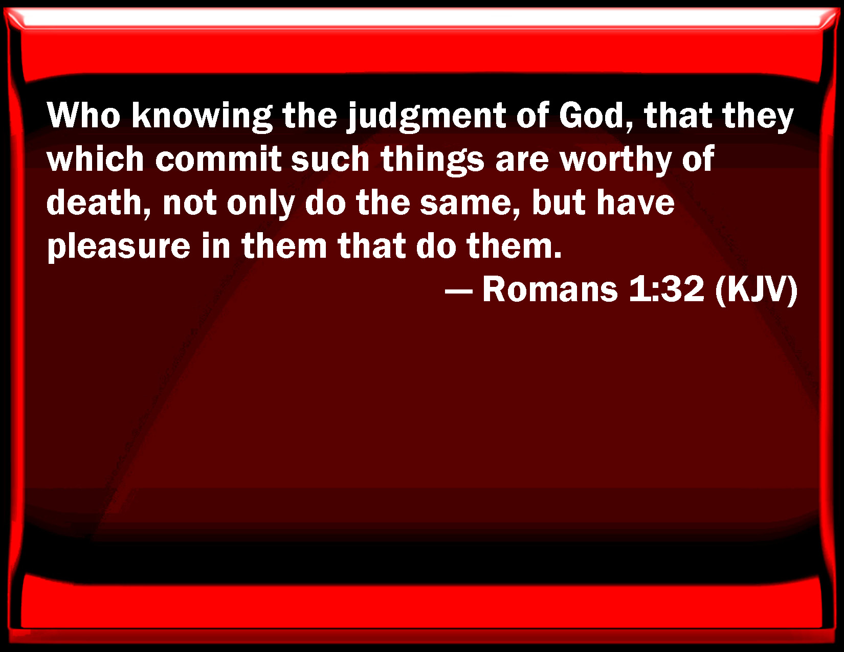 Bible Verse Slide Romans 1:32 Who knowing the judgment of God, that they which commit such things are worthy of death, not only do the same, but have pleasure in them that do them. KJV: Who knowing the judgment of God, that they which commit such things are worthy of death, not only do the same, but have pleasure in them that do them. DRB: Who, having known the justice of God, did not understand that they who do such things, are worthy of death; and not only they that do them, but they also that consent to them that do them. DBT: who knowing the righteous judgment of God, that they who do such things are worthy of death, not only practise them, but have fellow delight in those who do them. ERV: who, knowing the ordinance of God, that they which practise such things are worthy of death, not only do the same, but also consent with them that practise them. WBT: Who, knowing the judgment of God, that they who commit such things are worthy of death; not only do the same, but have pleasure in them that do them. WEB: who, knowing the ordinance of God, that those who practice such things are worthy of death, not only do the same, but also approve of those who practice them. YLT: who the righteous judgment of God having known — that those practising such things are worthy of death — not only do them, but also have delight with those practising them.Links Romans 1:32 NIV • Romans 1:32 NLT • Romans 1:32 ESV • Romans 1:32 NASB • Romans 1:32 KJV • Romans 1:32 Interlinear • Romans 1:32 Commentaries • Romans 1:32 Parallel Texts • Romans 1:32 Bible Apps • Romans 1:32 Parallel • Bible Hub |