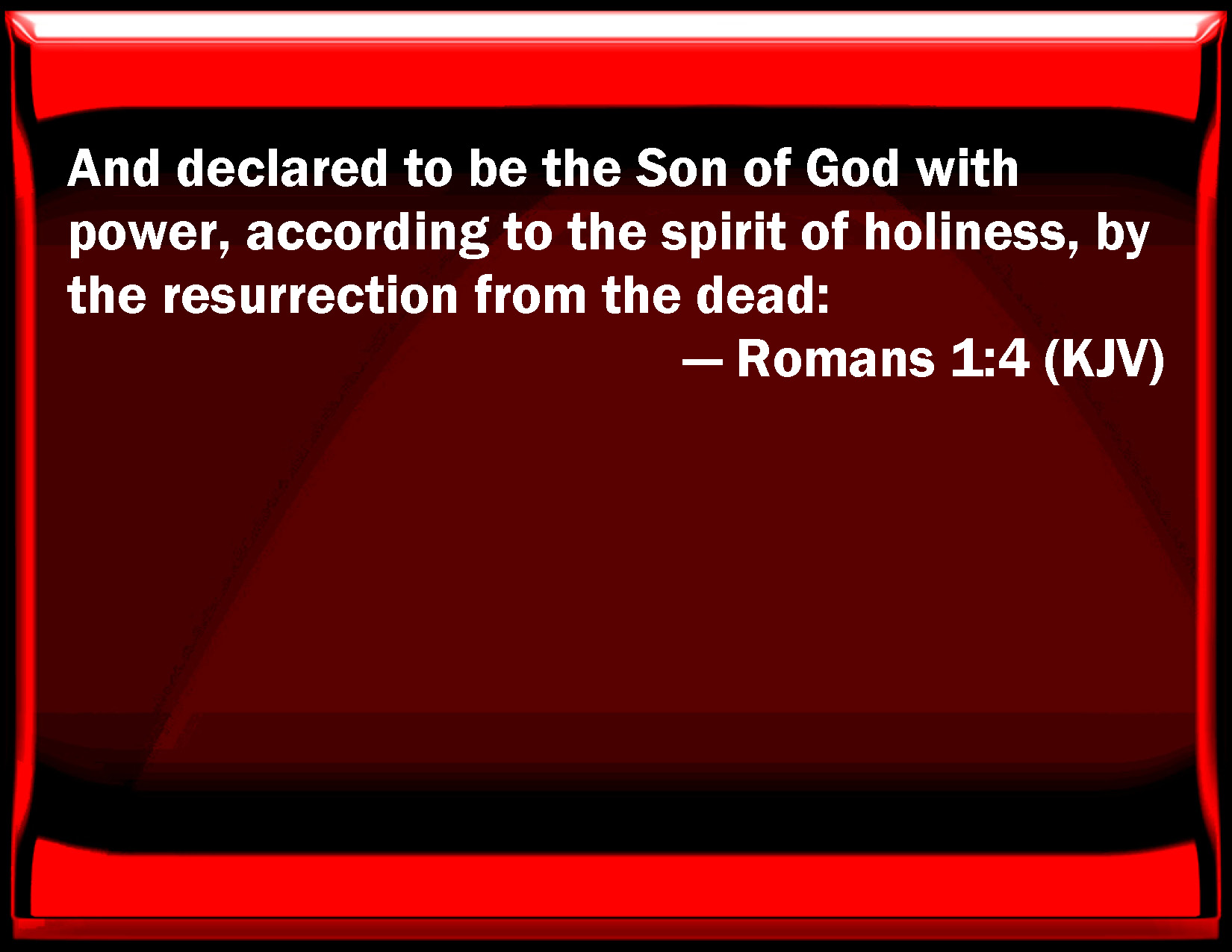 Bible Verse Slide Romans 1:4 And declared to be the Son of God with power, according to the spirit of holiness, by the resurrection from the dead: KJV: And declared to be the Son of God with power, according to the spirit of holiness, by the resurrection from the dead: DRB: Who was predestinated the Son of God in power, according to the spirit of sanctification, by the resurrection of our Lord Jesus Christ from the dead; DBT: marked out Son of God in power, according to the Spirit of holiness, by resurrection of the dead) Jesus Christ our Lord; ERV: who was declared to be the Son of God with power, according to the spirit of holiness, by the resurrection of the dead; even Jesus Christ our Lord, WBT: And declared to be the Son of God, with power, according to the spirit of holiness, by the resurrection from the dead: WEB: who was declared to be the Son of God with power, according to the Spirit of holiness, by the resurrection from the dead, Jesus Christ our Lord, YLT: who is marked out Son of God in power, according to the Spirit of sanctification, by the rising again from the dead,) Jesus Christ our Lord;Links Romans 1:4 NIV • Romans 1:4 NLT • Romans 1:4 ESV • Romans 1:4 NASB • Romans 1:4 KJV • Romans 1:4 Interlinear • Romans 1:4 Commentaries • Romans 1:4 Parallel Texts • Romans 1:4 Bible Apps • Romans 1:4 Parallel • Bible Hub |