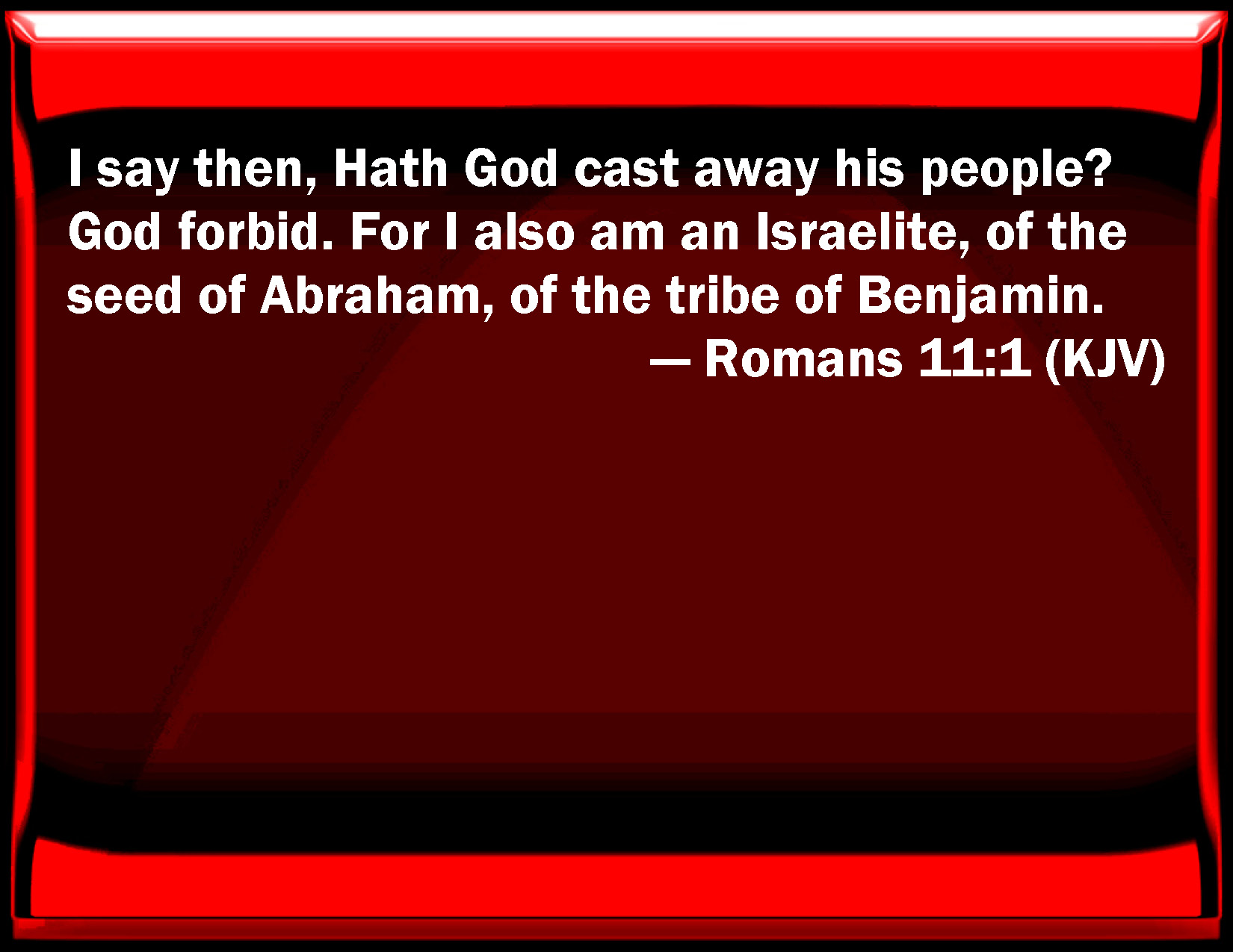 Bible Verse Slide Romans 11:1 I say then, Has God cast away his people? God forbid. For I also am an Israelite, of the seed of Abraham, of the tribe of Benjamin. KJV: I say then, Hath God cast away his people? God forbid. For I also am an Israelite, of the seed of Abraham, of the tribe of Benjamin. DRB: I SAY then: Hath God cast away his people? God forbid. For I also am an Israelite of the seed of Abraham, of the tribe of Benjamin. DBT: I say then, Has God cast away his people? Far be the thought. For I also am an Israelite, of the seed of Abraham, of the tribe of Benjamin. ERV: I say then, Did God cast off his people? God forbid. For I also am an Israelite, of the seed of Abraham, of the tribe of Benjamin. WBT: I say then, Hath God cast away his people? By no means. For I also am an Israelite, of the seed of Abraham, of the tribe of Benjamin. WEB: I ask then, did God reject his people? May it never be! For I also am an Israelite, a descendant of Abraham, of the tribe of Benjamin. YLT: I say, then, Did God cast away His people? let it not be! for I also am an Israelite, of the seed of Abraham, of the tribe of Benjamin:Links Romans 11:1 NIV • Romans 11:1 NLT • Romans 11:1 ESV • Romans 11:1 NASB • Romans 11:1 KJV • Romans 11:1 Interlinear • Romans 11:1 Commentaries • Romans 11:1 Parallel Texts • Romans 11:1 Bible Apps • Romans 11:1 Parallel • Bible Hub |