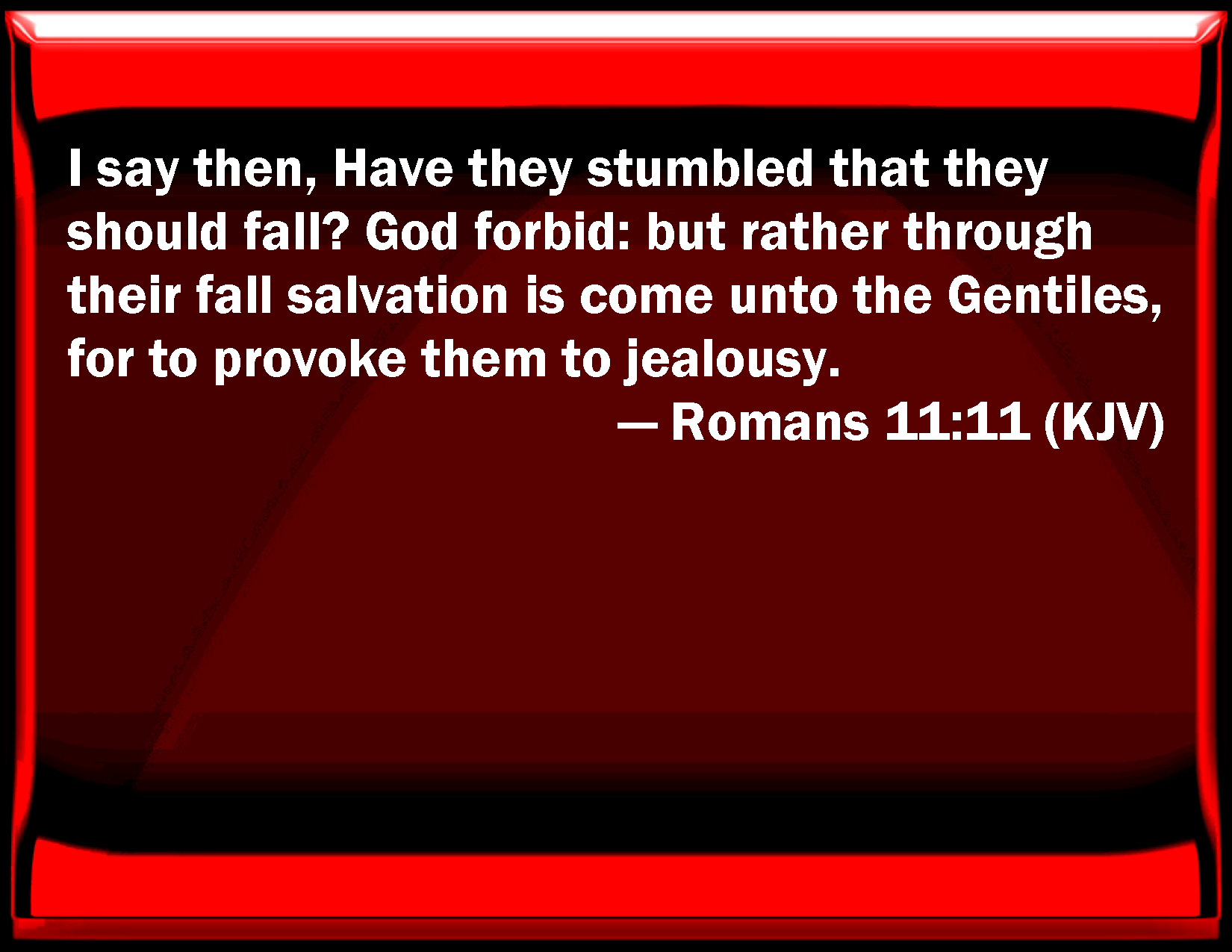 Bible Verse Slide Romans 11:11 I say then, Have they stumbled that they should fall? God forbid: but rather through their fall salvation is come to the Gentiles, for to provoke them to jealousy. KJV: I say then, Have they stumbled that they should fall? God forbid: but rather through their fall salvation is come unto the Gentiles, for to provoke them to jealousy. DRB: I say then, have they so stumbled, that they should fall? God forbid. But by their offence, salvation is come to the Gentiles, that they may be emulous of them. DBT: I say then, Have they stumbled in order that they might fall? Far be the thought: but by their fall there is salvation to the nations to provoke them to jealousy. ERV: I say then, Did they stumble that they might fall? God forbid: but by their fall salvation is come unto the Gentiles, for to provoke them to jealousy. WBT: I say then, Have they stumbled that they should fall? By no means: but rather through their fall salvation is come to the Gentiles, to provoke them to jealousy. WEB: I ask then, did they stumble that they might fall? May it never be! But by their fall salvation has come to the Gentiles, to provoke them to jealousy. YLT: I say, then, Did they stumble that they might fall? let it not be! but by their fall the salvation is to the nations, to arouse them to jealousy;Links Romans 11:11 NIV • Romans 11:11 NLT • Romans 11:11 ESV • Romans 11:11 NASB • Romans 11:11 KJV • Romans 11:11 Interlinear • Romans 11:11 Commentaries • Romans 11:11 Parallel Texts • Romans 11:11 Bible Apps • Romans 11:11 Parallel • Bible Hub |