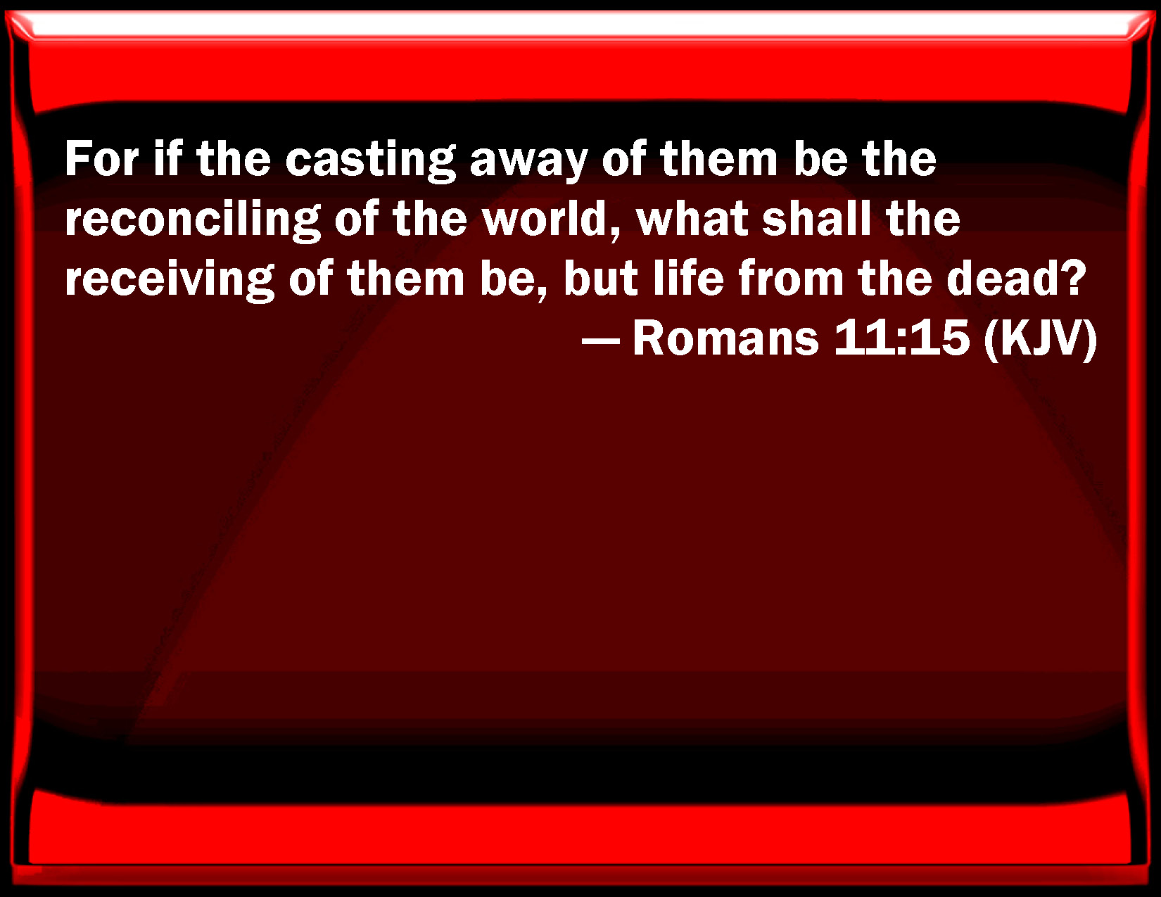 Bible Verse Slide Romans 11:15 For if the casting away of them be the reconciling of the world, what shall the receiving of them be, but life from the dead? KJV: For if the casting away of them be the reconciling of the world, what shall the receiving of them be, but life from the dead? DRB: For if the loss of them be the reconciliation of the world, what shall the receiving of them be, but life from the dead? DBT: For if their casting away be the world's reconciliation, what their reception but life from among the dead? ERV: For if the casting away of them is the reconciling of the world, what shall the receiving of them be, but life from the dead? WBT: For if the rejection of them be the reconciling of the world, what shall the receiving of them be, but life from the dead? WEB: For if the rejection of them is the reconciling of the world, what would their acceptance be, but life from the dead? YLT: for if the casting away of them is a reconciliation of the world, what the reception — if not life out of the dead?Links Romans 11:15 NIV • Romans 11:15 NLT • Romans 11:15 ESV • Romans 11:15 NASB • Romans 11:15 KJV • Romans 11:15 Interlinear • Romans 11:15 Commentaries • Romans 11:15 Parallel Texts • Romans 11:15 Bible Apps • Romans 11:15 Parallel • Bible Hub |