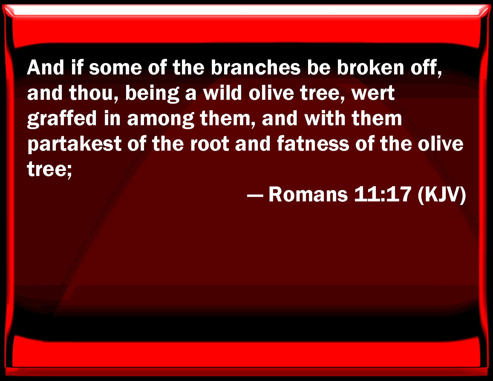 Bible Verse Slide Romans 11:17 And if some of the branches be broken off, and you, being a wild olive tree, were grafted in among them, and with them partake of the root and fatness of the olive tree; KJV: And if some of the branches be broken off, and thou, being a wild olive tree, wert graffed in among them, and with them partakest of the root and fatness of the olive tree; DRB: And if some of the branches be broken, and thou, being a wild olive, art ingrafted in them, and art made partaker of the root, and of the fatness of the olive tree, DBT: Now if some of the branches have been broken out, and thou, being a wild olive tree, hast been grafted in amongst them, and hast become a fellow-partaker of the root and of the fatness of the olive tree, ERV: But if some of the branches were broken off, and thou, being a wild olive, wast grafted in among them, and didst become partaker with them of the root of the fatness of the olive tree; WBT: And if some of the branches be broken off, and thou, being a wild olive-tree, art ingrafted among them, and with them partakest of the root and fatness of the olive-tree; WEB: But if some of the branches were broken off, and you, being a wild olive, were grafted in among them, and became partaker with them of the root and of the richness of the olive tree; YLT: And if certain of the branches were broken off, and thou, being a wild olive tree, wast graffed in among them, and a fellow-partaker of the root and of the fatness of the olive tree didst become — Links Romans 11:17 NIV • Romans 11:17 NLT • Romans 11:17 ESV • Romans 11:17 NASB • Romans 11:17 KJV • Romans 11:17 Interlinear • Romans 11:17 Commentaries • Romans 11:17 Parallel Texts • Romans 11:17 Bible Apps • Romans 11:17 Parallel • Bible Hub |