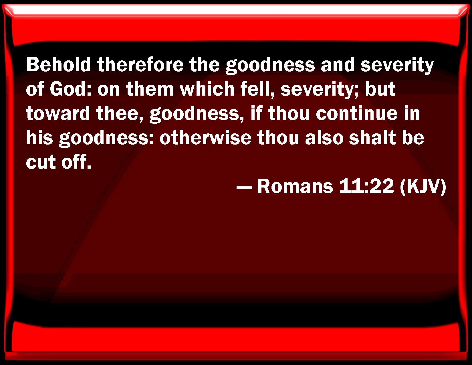 Bible Verse Slide Romans 11:22 Behold therefore the goodness and severity of God: on them which fell, severity; but toward you, goodness, if you continue in his goodness: otherwise you also shall be cut off. KJV: Behold therefore the goodness and severity of God: on them which fell, severity; but toward thee, goodness, if thou continue in his goodness: otherwise thou also shalt be cut off. DRB: See then the goodness and the severity of God: towards them indeed that are fallen, the severity; but towards thee, the goodness of God, if thou abide in goodness, otherwise thou also shalt be cut off. DBT: Behold then the goodness and severity of God: upon them who have fallen, severity; upon thee goodness of God, if thou shalt abide in goodness, since otherwise thou also wilt be cut away. ERV: Behold then the goodness and severity of God: toward them that fell, severity; but toward thee, God's goodness, if thou continue in his goodness: otherwise thou also shalt be cut off. WBT: Behold therefore the goodness and severity of God: on them who fell, severity; but towards thee, goodness, if thou shalt continue in his goodness: otherwise thou also shalt be cut off. WEB: See then the goodness and severity of God. Toward those who fell, severity; but toward you, goodness, if you continue in his goodness; otherwise you also will be cut off. YLT: Lo, then, goodness and severity of God — upon those indeed who fell, severity; and upon thee, goodness, if thou mayest remain in the goodness, otherwise, thou also shalt be cut off.Links Romans 11:22 NIV • Romans 11:22 NLT • Romans 11:22 ESV • Romans 11:22 NASB • Romans 11:22 KJV • Romans 11:22 Interlinear • Romans 11:22 Commentaries • Romans 11:22 Parallel Texts • Romans 11:22 Bible Apps • Romans 11:22 Parallel • Bible Hub |
