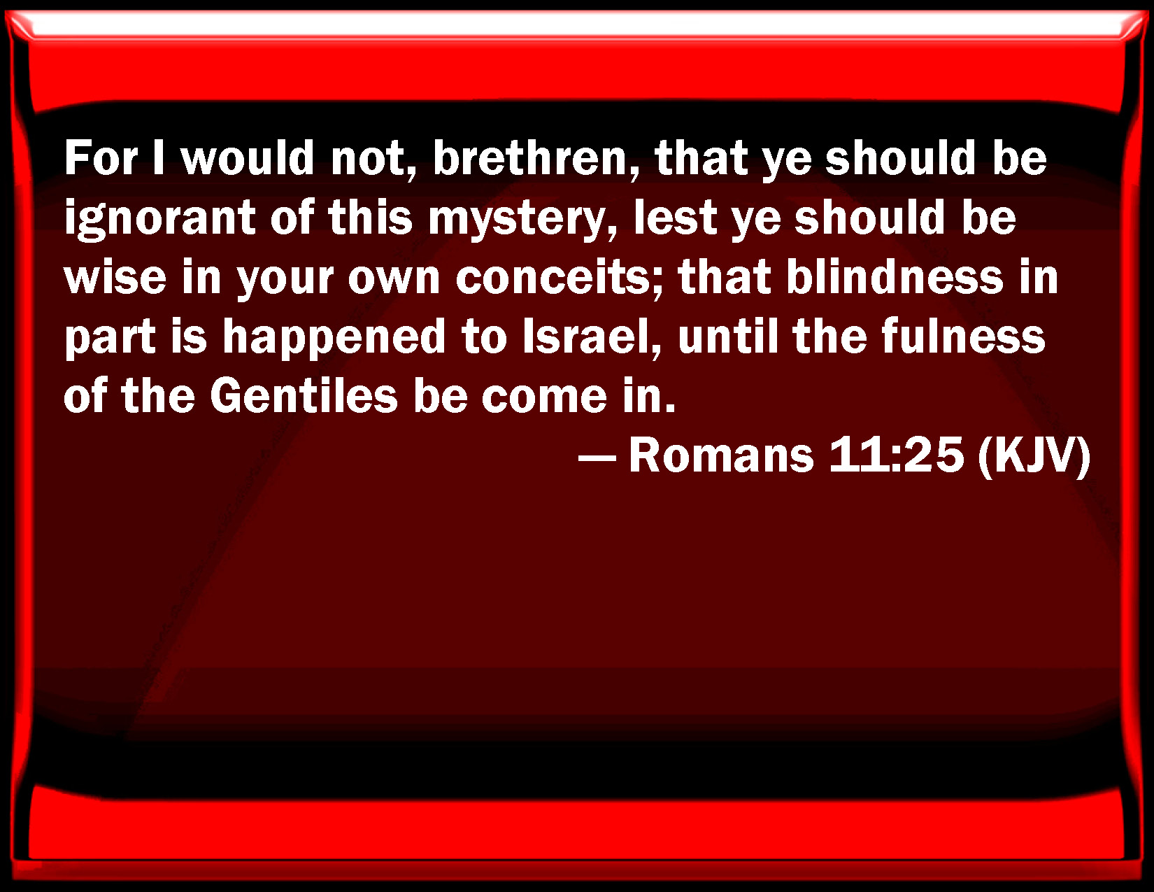 Bible Verse Slide Romans 11:25 For I would not, brothers, that you should be ignorant of this mystery, lest you should be wise in your own conceits; that blindness in part is happened to Israel, until the fullness of the Gentiles be come in. KJV: For I would not, brethren, that ye should be ignorant of this mystery, lest ye should be wise in your own conceits; that blindness in part is happened to Israel, until the fulness of the Gentiles be come in. DRB: For I would not have you ignorant, brethren, of this mystery, (lest you should be wise in your own conceits), that blindness in part has happened in Israel, until the fulness of the Gentiles should come in. DBT: For I do not wish you to be ignorant, brethren, of this mystery, that ye may not be wise in your own conceits, that blindness in part is happened to Israel, until the fulness of the nations be come in; ERV: For I would not, brethren, have you ignorant of this mystery, lest ye be wise in your own conceits, that a hardening in part hath befallen Israel, until the fulness of the Gentiles be come in; WBT: For I would not, brethren, that ye should be ignorant of this mystery, (lest ye should be wise in your own conceits) that blindness in part hath happened to Israel, until the fullness of the Gentiles shall be come in. WEB: For I don't desire you to be ignorant, brothers, of this mystery, so that you won't be wise in your own conceits, that a partial hardening has happened to Israel, until the fullness of the Gentiles has come in, YLT: For I do not wish you to be ignorant, brethren, of this secret — that ye may not be wise in your own conceits — that hardness in part to Israel hath happened till the fulness of the nations may come in;Links Romans 11:25 NIV • Romans 11:25 NLT • Romans 11:25 ESV • Romans 11:25 NASB • Romans 11:25 KJV • Romans 11:25 Interlinear • Romans 11:25 Commentaries • Romans 11:25 Parallel Texts • Romans 11:25 Bible Apps • Romans 11:25 Parallel • Bible Hub |