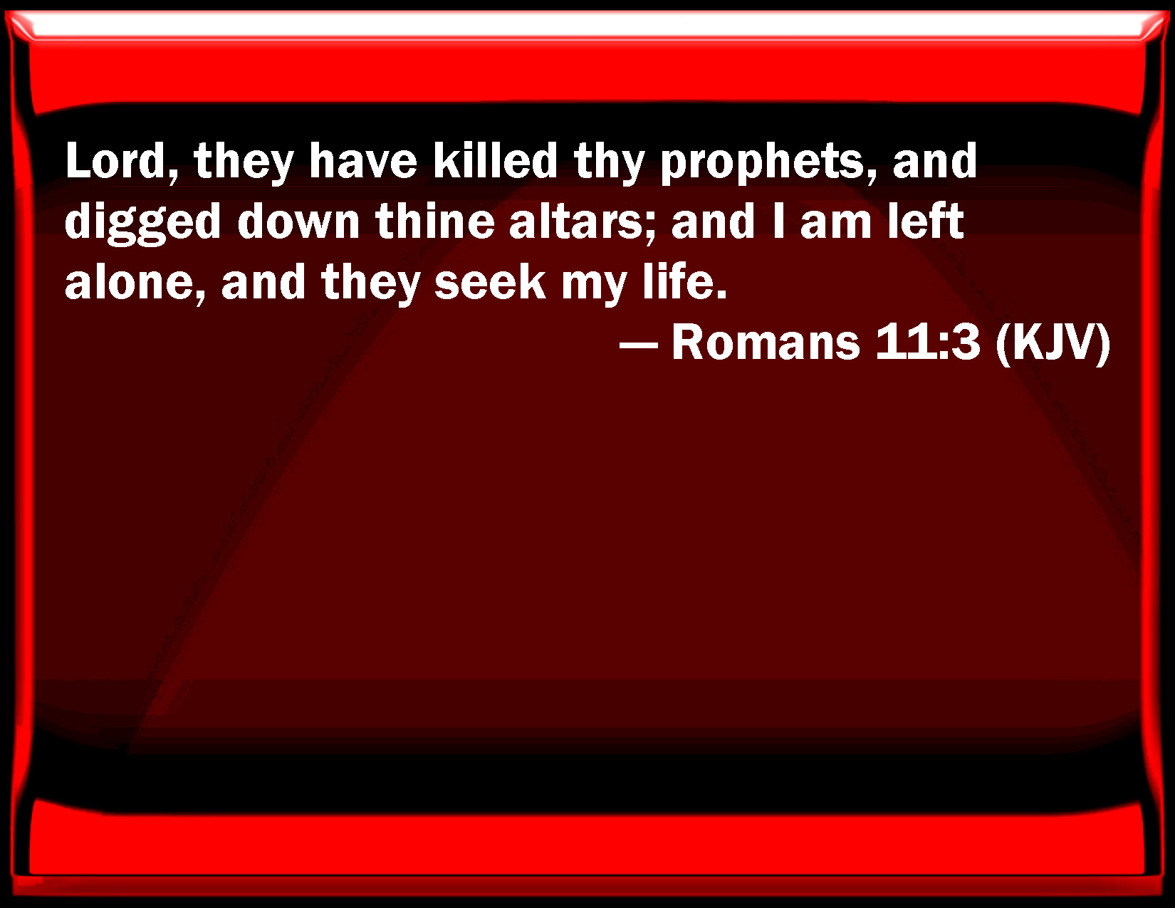 Bible Verse Slide Romans 11:3 Lord, they have killed your prophets, and dig down your altars; and I am left alone, and they seek my life. KJV: Lord, they have killed thy prophets, and digged down thine altars; and I am left alone, and they seek my life. DRB: Lord, they have slain thy prophets, they have dug down thy altars; and I am left alone, and they seek my life. DBT: Lord, they have killed thy prophets, they have dug down thine altars; and I have been left alone, and they seek my life. ERV: Lord, they have killed thy prophets, they have digged down thine altars: and I am left alone, and they seek my life. WBT: Lord, they have killed thy prophets, and digged down thy altars; and I am left alone, and they seek my life. WEB: "Lord, they have killed your prophets, they have broken down your altars; and I am left alone, and they seek my life." YLT: 'Lord, Thy prophets they did kill, and Thy altars they dug down, and I was left alone, and they seek my life;'Links Romans 11:3 NIV • Romans 11:3 NLT • Romans 11:3 ESV • Romans 11:3 NASB • Romans 11:3 KJV • Romans 11:3 Interlinear • Romans 11:3 Commentaries • Romans 11:3 Parallel Texts • Romans 11:3 Bible Apps • Romans 11:3 Parallel • Bible Hub |