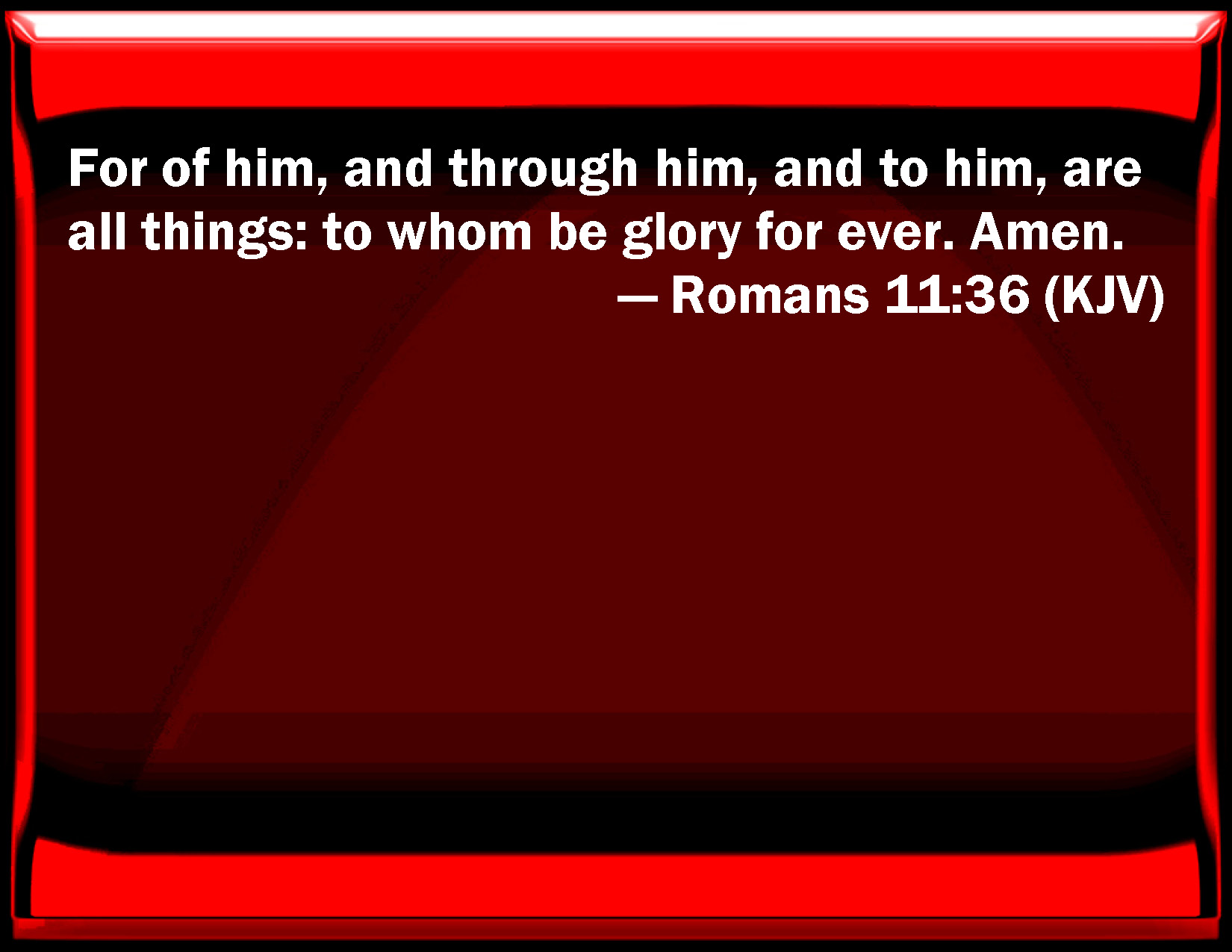Bible Verse Slide Romans 11:36 For of him, and through him, and to him, are all things: to whom be glory for ever. Amen. KJV: For of him, and through him, and to him, are all things: to whom be glory for ever. Amen. DRB: For of him, and by him, and in him, are all things: to him be glory for ever. Amen. DBT: For of him, and through him, and for him are all things: to him be glory for ever. Amen. ERV: For of him, and through him, and unto him, are all things. To him be the glory for ever. Amen. WBT: For from him, and by him, and to him are all things: to whom be glory for ever. Amen. WEB: For of him, and through him, and to him, are all things. To him be the glory for ever! Amen. YLT: because of Him, and through Him, and to Him are the all things; to Him is the glory — to the ages. Amen.Links Romans 11:36 NIV • Romans 11:36 NLT • Romans 11:36 ESV • Romans 11:36 NASB • Romans 11:36 KJV • Romans 11:36 Interlinear • Romans 11:36 Commentaries • Romans 11:36 Parallel Texts • Romans 11:36 Bible Apps • Romans 11:36 Parallel • Bible Hub |