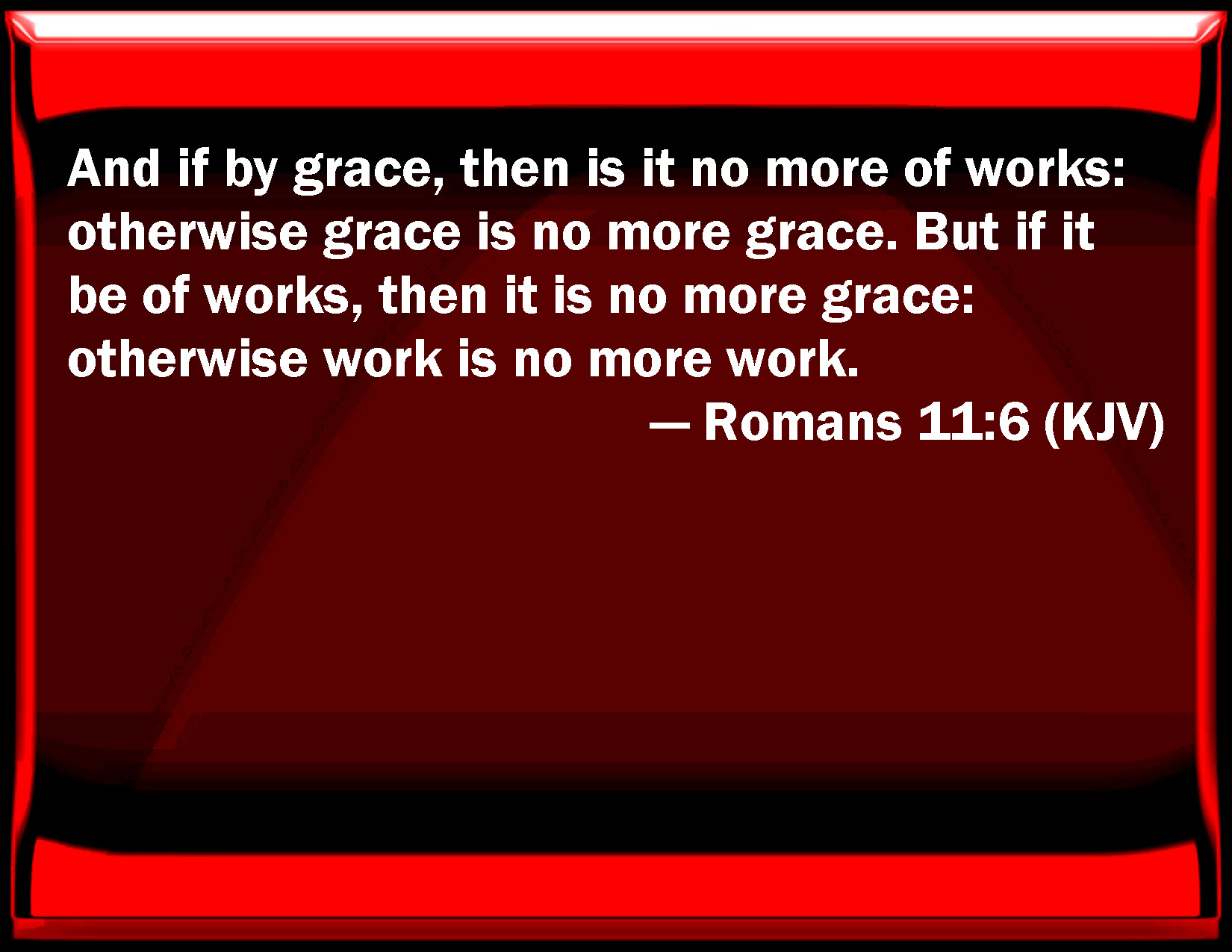 Bible Verse Slide Romans 11:6 And if by grace, then is it no more of works: otherwise grace is no more grace. But if it be of works, then it is no more grace: otherwise work is no more work. KJV: And if by grace, then is it no more of works: otherwise grace is no more grace. But if it be of works, then is it no more grace: otherwise work is no more work. DRB: And if by grace, it is not now by works: otherwise grace is no more grace. DBT: But if by grace, no longer of works: since otherwise grace is no more grace. ERV: But if it is by grace, it is no more of works: otherwise grace is no more grace. WBT: And if by grace, then is it no more of works: otherwise grace is no more grace. But if of works, then is it no more grace: otherwise work is no more work. WEB: And if by grace, then it is no longer of works; otherwise grace is no longer grace. But if it is of works, it is no longer grace; otherwise work is no longer work. YLT: and if by grace, no more of works, otherwise the grace becometh no more grace; and if of works, it is no more grace, otherwise the work is no more work.Links Romans 11:6 NIV • Romans 11:6 NLT • Romans 11:6 ESV • Romans 11:6 NASB • Romans 11:6 KJV • Romans 11:6 Interlinear • Romans 11:6 Commentaries • Romans 11:6 Parallel Texts • Romans 11:6 Bible Apps • Romans 11:6 Parallel • Bible Hub |