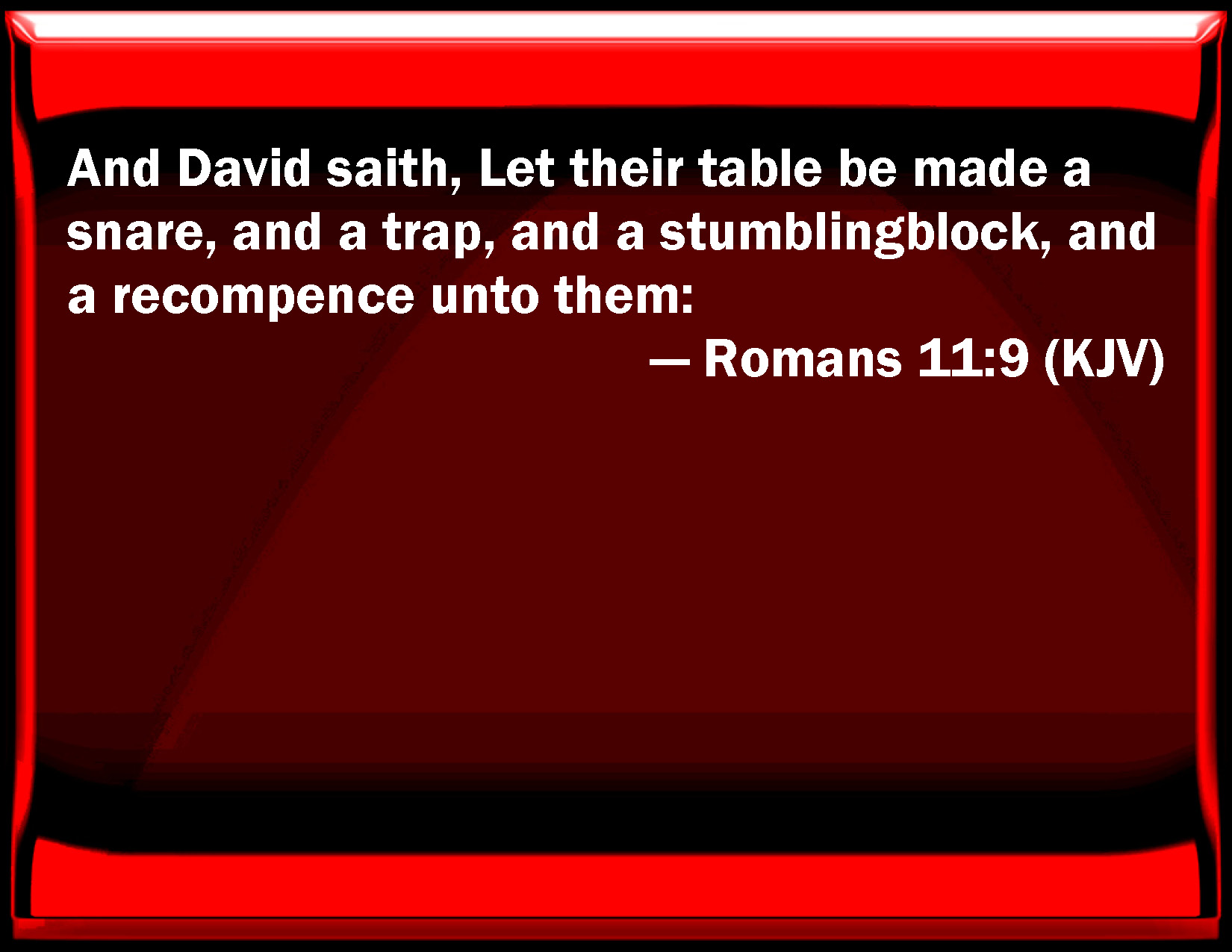 Bible Verse Slide Romans 11:9 And David said, Let their table be made a snare, and a trap, and a stumbling block, and a recompense to them: KJV: And David saith, Let their table be made a snare, and a trap, and a stumblingblock, and a recompence unto them: DRB: And David saith: Let their table be made a snare, and a trap, and a stumblingblock, and a recompense unto them. DBT: And David says, Let their table be for a snare, and for a gin, and for a fall-trap, and for a recompense to them: ERV: And David saith, Let their table be made a snare, and a trap, And a stumblingblock, and a recompense unto them: WBT: And David saith, Let their table be made a snare, and a trap, and a stumbling-block, and a recompense to them: WEB: David says, "Let their table be made a snare, and a trap, a stumbling block, and a retribution to them. YLT: and David saith, 'Let their table become for a snare, and for a trap, and for a stumbling-block, and for a recompense to them;Links Romans 11:9 NIV • Romans 11:9 NLT • Romans 11:9 ESV • Romans 11:9 NASB • Romans 11:9 KJV • Romans 11:9 Interlinear • Romans 11:9 Commentaries • Romans 11:9 Parallel Texts • Romans 11:9 Bible Apps • Romans 11:9 Parallel • Bible Hub |