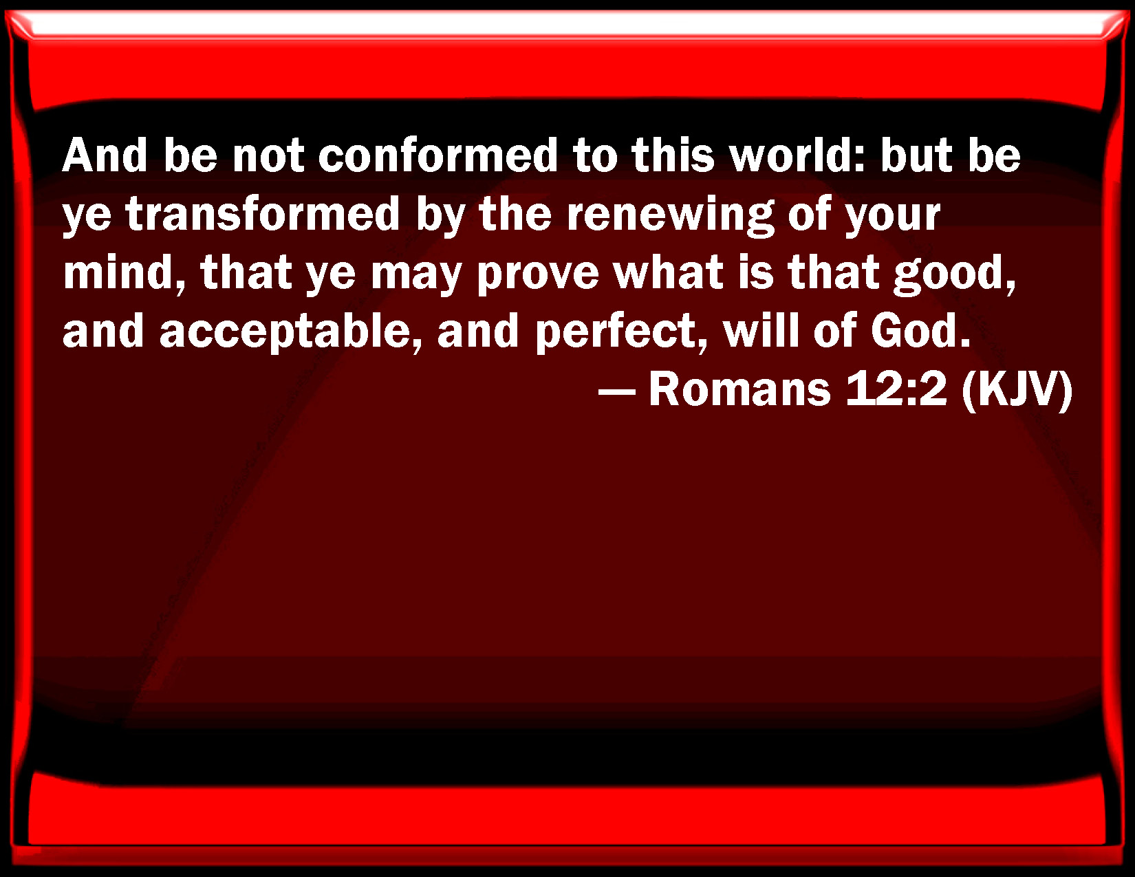 Bible Verse Slide Romans 12:2 And be not conformed to this world: but be you transformed by the renewing of your mind, that you may prove what is that good, and acceptable, and perfect, will of God. KJV: And be not conformed to this world: but be ye transformed by the renewing of your mind, that ye may prove what is that good, and acceptable, and perfect, will of God. DRB: And be not conformed to this world; but be reformed in the newness of your mind, that you may prove what is the good, and the acceptable, and the perfect will of God. DBT: And be not conformed to this world, but be transformed by the renewing of your mind, that ye may prove what is the good and acceptable and perfect will of God. ERV: And be not fashioned according to this world: but be ye transformed by the renewing of your mind, that ye may prove what is the good and acceptable and perfect will of God. WBT: And be not conformed to this world: but be ye transformed by the renewing of your mind, that ye may prove what is that good and acceptable, and perfect will of God. WEB: Don't be conformed to this world, but be transformed by the renewing of your mind, so that you may prove what is the good, well-pleasing, and perfect will of God. YLT: and be not conformed to this age, but be transformed by the renewing of your mind, for your proving what is the will of God — the good, and acceptable, and perfect.Links Romans 12:2 NIV • Romans 12:2 NLT • Romans 12:2 ESV • Romans 12:2 NASB • Romans 12:2 KJV • Romans 12:2 Interlinear • Romans 12:2 Commentaries • Romans 12:2 Parallel Texts • Romans 12:2 Bible Apps • Romans 12:2 Parallel • Bible Hub |