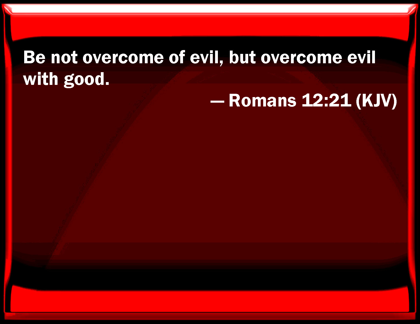 Bible Verse Slide Romans 12:21 Be not overcome of evil, but overcome evil with good. KJV: Be not overcome of evil, but overcome evil with good. DRB: Be not overcome by evil, but overcome evil by good. DBT: Be not overcome by evil, but overcome evil with good. ERV: Be not overcome of evil, but overcome evil with good. WBT: Be not overcome by evil, but overcome evil with good. WEB: Don't be overcome by evil, but overcome evil with good. YLT: Be not overcome by the evil, but overcome, in the good, the evil.Links Romans 12:21 NIV • Romans 12:21 NLT • Romans 12:21 ESV • Romans 12:21 NASB • Romans 12:21 KJV • Romans 12:21 Interlinear • Romans 12:21 Commentaries • Romans 12:21 Parallel Texts • Romans 12:21 Bible Apps • Romans 12:21 Parallel • Bible Hub |