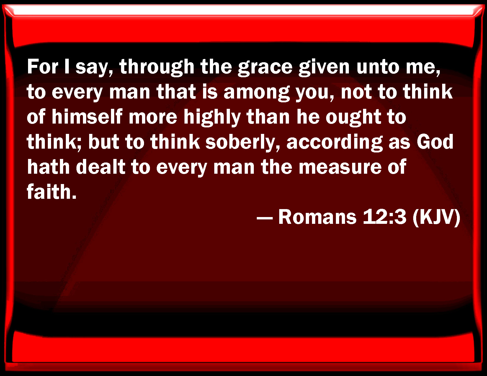 Bible Verse Slide Romans 12:3 For I say, through the grace given to me, to every man that is among you, not to think of himself more highly than he ought to think; but to think soberly, according as God has dealt to every man the measure of faith. KJV: For I say, through the grace given unto me, to every man that is among you, not to think of himself more highly than he ought to think; but to think soberly, according as God hath dealt to every man the measure of faith. DRB: For I say, by the grace that is given me, to all that are among you, not to be more wise than it behoveth to be wise, but to be wise unto sobriety, and according as God hath divided to every one the measure of faith. DBT: For I say, through the grace which has been given to me, to every one that is among you, not to have high thoughts above what he should think; but to think so as to be wise, as God has dealt to each a measure of faith. ERV: For I say, through the grace that was given me, to every man that is among you, not to think of himself more highly than he ought to think; but so to think as to think soberly, according as God hath dealt to each man a measure of faith. WBT: For through the grace given to me, I say, to every man that is among you, not to think of himself more highly than he ought to think; but to think soberly, according as God hath dealt to every man the measure of faith. WEB: For I say, through the grace that was given me, to every man who is among you, not to think of himself more highly than he ought to think; but to think reasonably, as God has apportioned to each person a measure of faith. YLT: For I say, through the grace that was given to me, to every one who is among you, not to think above what it behoveth to think; but to think so as to think wisely, as to each God did deal a measure of faith,Links Romans 12:3 NIV • Romans 12:3 NLT • Romans 12:3 ESV • Romans 12:3 NASB • Romans 12:3 KJV • Romans 12:3 Interlinear • Romans 12:3 Commentaries • Romans 12:3 Parallel Texts • Romans 12:3 Bible Apps • Romans 12:3 Parallel • Bible Hub |