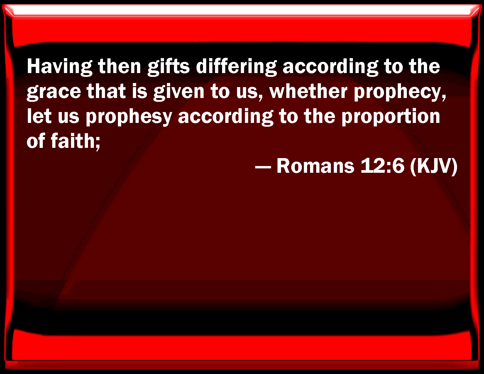 Bible Verse Slide Romans 12:6 Having then gifts differing according to the grace that is given to us, whether prophecy, let us prophesy according to the proportion of faith; KJV: Having then gifts differing according to the grace that is given to us, whether prophecy, let us prophesy according to the proportion of faith; DRB: And having different gifts, according to the grace that is given us, either prophecy, to be used according to the rule of faith; DBT: But having different gifts, according to the grace which has been given to us, whether it be prophecy, let us prophesy according to the proportion of faith; ERV: And having gifts differing according to the grace that was given to us, whether prophecy, let us prophesy according to the proportion of our faith; WBT: Having then gifts differing according to the grace that is given to us, whether prophecy, let us prophesy according to the proportion of faith; WEB: Having gifts differing according to the grace that was given to us, if prophecy, let us prophesy according to the proportion of our faith; YLT: And having gifts, different according to the grace that was given to us; whether prophecy — 'According to the proportion of faith!'Links Romans 12:6 NIV • Romans 12:6 NLT • Romans 12:6 ESV • Romans 12:6 NASB • Romans 12:6 KJV • Romans 12:6 Interlinear • Romans 12:6 Commentaries • Romans 12:6 Parallel Texts • Romans 12:6 Bible Apps • Romans 12:6 Parallel • Bible Hub |