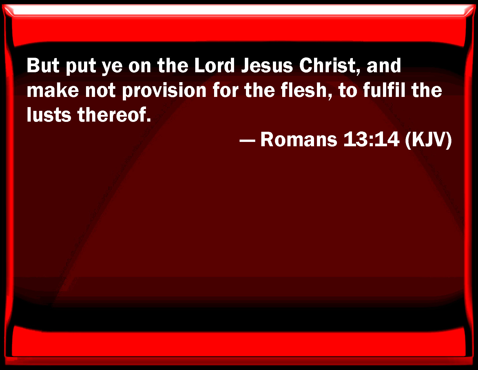 Bible Verse Slide Romans 13:14 But put you on the Lord Jesus Christ, and make not provision for the flesh, to fulfill the lusts thereof. KJV: But put ye on the Lord Jesus Christ, and make not provision for the flesh, to fulfil the lusts thereof. DRB: But put ye on the Lord Jesus Christ, and make not provision for the flesh in its concupiscences. DBT: But put on the Lord Jesus Christ, and do not take forethought for the flesh to fulfil its lusts. ERV: But put ye on the Lord Jesus Christ, and make not provision for the flesh, to fulfill the lusts thereof. WBT: But put ye on the Lord Jesus Christ, and make not provision for the lusts of flesh. WEB: But put on the Lord Jesus Christ, and make no provision for the flesh, for its lusts. YLT: but put ye on the Lord Jesus Christ, and for the flesh take no forethought — for desires.Links Romans 13:14 NIV • Romans 13:14 NLT • Romans 13:14 ESV • Romans 13:14 NASB • Romans 13:14 KJV • Romans 13:14 Interlinear • Romans 13:14 Commentaries • Romans 13:14 Parallel Texts • Romans 13:14 Bible Apps • Romans 13:14 Parallel • Bible Hub |