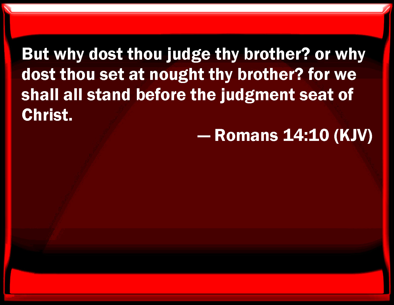 Bible Verse Slide Romans 14:10 But why do you judge your brother? or why do you set at nothing your brother? for we shall all stand before the judgment seat of Christ. KJV: But why dost thou judge thy brother? or why dost thou set at nought thy brother? for we shall all stand before the judgment seat of Christ. DRB: But thou, why judgest thou thy brother? or thou, why dost thou despise thy brother? For we shall all stand before the judgment seat of Christ. DBT: But thou, why judgest thou thy brother? or again, thou, why dost thou make little of thy brother? for we shall all be placed before the judgment-seat of God. ERV: But thou, why dost thou judge thy brother? or thou again, why dost thou set at nought thy brother? for we shall all stand before the judgment-seat of God. WBT: But why dost thou judge thy brother? or why dost thou set at naught thy brother? for we shall all stand before the judgment-seat of Christ. WEB: But you, why do you judge your brother? Or you again, why do you despise your brother? For we will all stand before the judgment seat of Christ. YLT: And thou, why dost thou judge thy brother? or again, thou, why dost thou set at nought thy brother? for we shall all stand at the tribunal of the Christ;Links Romans 14:10 NIV • Romans 14:10 NLT • Romans 14:10 ESV • Romans 14:10 NASB • Romans 14:10 KJV • Romans 14:10 Interlinear • Romans 14:10 Commentaries • Romans 14:10 Parallel Texts • Romans 14:10 Bible Apps • Romans 14:10 Parallel • Bible Hub |