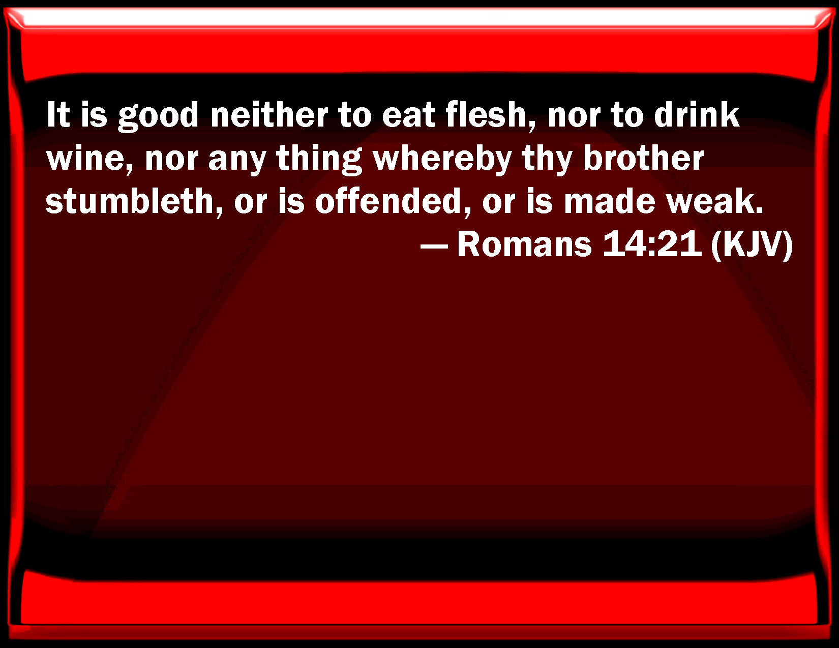 Bible Verse Slide Romans 14:21 It is good neither to eat flesh, nor to drink wine, nor any thing whereby your brother stumbles, or is offended, or is made weak. KJV: It is good neither to eat flesh, nor to drink wine, nor any thing whereby thy brother stumbleth, or is offended, or is made weak. DRB: It is good not to eat flesh, and not to drink wine, nor any thing whereby thy brother is offended, or scandalized, or made weak. DBT: It is right not to eat meat, nor drink wine, nor do anything in which thy brother stumbles, or is offended, or is weak. ERV: It is good not to eat flesh, nor to drink wine, nor to do anything whereby thy brother stumbleth. WBT: It is good neither to eat flesh, nor to drink wine, nor any thing by which thy brother stumbleth, or is offended, or is made weak. WEB: It is good to not eat meat, drink wine, nor do anything by which your brother stumbles, is offended, or is made weak. YLT: Right it is not to eat flesh, nor to drink wine, nor to do anything in which thy brother doth stumble, or is made to fall, or is weak.Links Romans 14:21 NIV • Romans 14:21 NLT • Romans 14:21 ESV • Romans 14:21 NASB • Romans 14:21 KJV • Romans 14:21 Interlinear • Romans 14:21 Commentaries • Romans 14:21 Parallel Texts • Romans 14:21 Bible Apps • Romans 14:21 Parallel • Bible Hub |