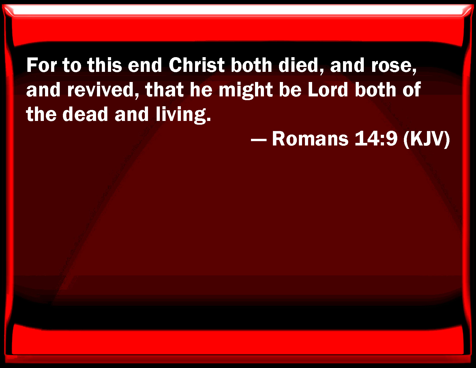 Bible Verse Slide Romans 14:9 For to this end Christ both died, and rose, and revived, that he might be Lord both of the dead and living. KJV: For to this end Christ both died, and rose, and revived, that he might be Lord both of the dead and living. DRB: For to this end Christ died and rose again; that he might be Lord both of the dead and of the living. DBT: For to this end Christ has died and lived again, that he might rule over both dead and living. ERV: For to this end Christ died, and lived again, that he might be Lord of both the dead and the living. WBT: For to this end Christ both died, and rose, and revived, that he might be Lord both of the dead and the living. WEB: For to this end Christ died, rose, and lived again, that he might be Lord of both the dead and the living. YLT: for because of this Christ both died and rose again, and lived again, that both of dead and of living he may be Lord.Links Romans 14:9 NIV • Romans 14:9 NLT • Romans 14:9 ESV • Romans 14:9 NASB • Romans 14:9 KJV • Romans 14:9 Interlinear • Romans 14:9 Commentaries • Romans 14:9 Parallel Texts • Romans 14:9 Bible Apps • Romans 14:9 Parallel • Bible Hub |
