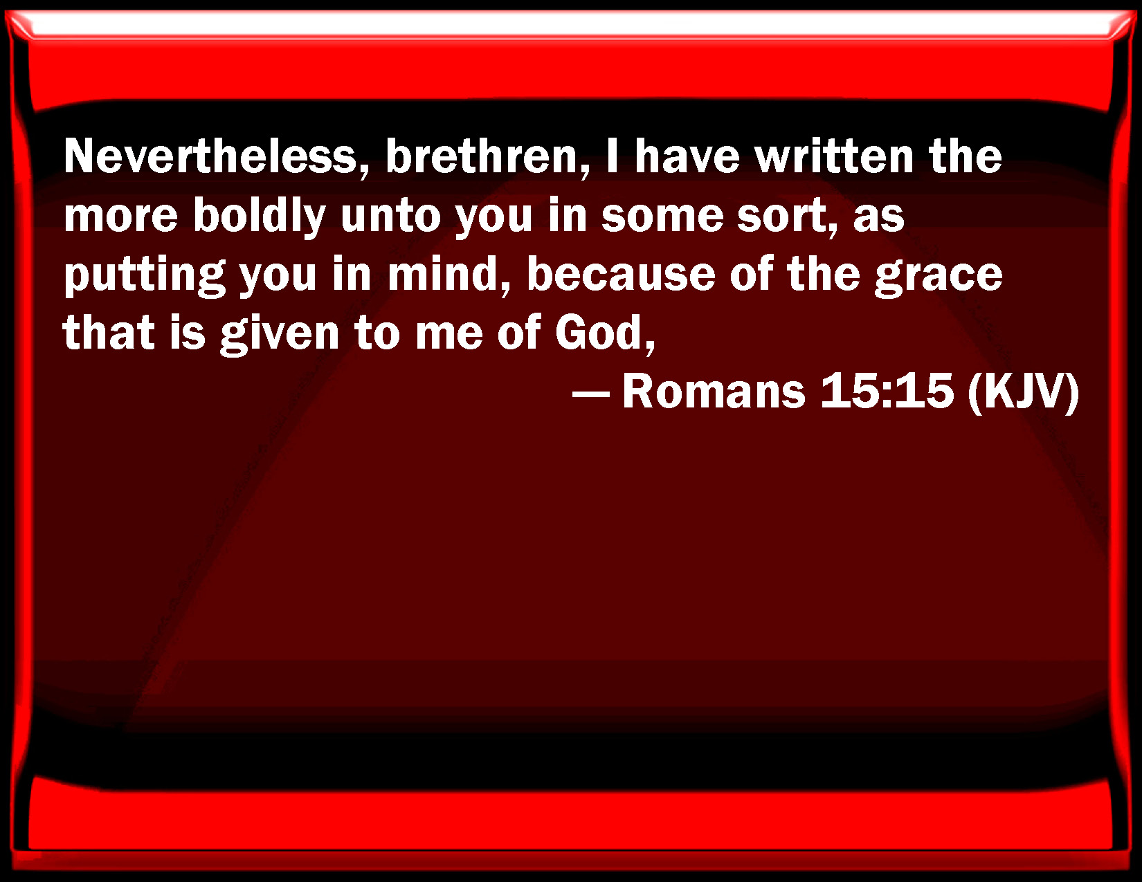 Bible Verse Slide Romans 15:15 Nevertheless, brothers, I have written the more boldly to you in some sort, as putting you in mind, because of the grace that is given to me of God, KJV: Nevertheless, brethren, I have written the more boldly unto you in some sort, as putting you in mind, because of the grace that is given to me of God, DRB: But I have written to you, brethren, more boldly in some sort, as it were putting you in mind: because of the grace which is given me from God. DBT: But I have written to you the more boldly, brethren, in part, as putting you in mind, because of the grace given to me by God, ERV: But I write the more boldly unto you in some measure, as putting you again in remembrance, because of the grace that was given me of God, WBT: Nevertheless, brethren, I have written the more boldly to you in some sort, as putting you in mind, because of the grace that is given to me from God. WEB: But I write the more boldly to you in part, as reminding you, because of the grace that was given to me by God, YLT: and the more boldly I did write to you, brethren, in part, as putting you in mind, because of the grace that is given to me by God,Links Romans 15:15 NIV • Romans 15:15 NLT • Romans 15:15 ESV • Romans 15:15 NASB • Romans 15:15 KJV • Romans 15:15 Interlinear • Romans 15:15 Commentaries • Romans 15:15 Parallel Texts • Romans 15:15 Bible Apps • Romans 15:15 Parallel • Bible Hub |