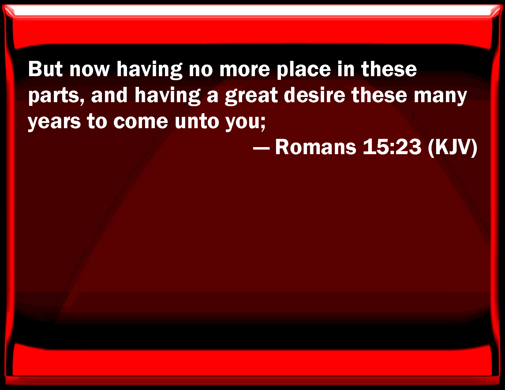 Bible Verse Slide Romans 15:23 But now having no more place in these parts, and having a great desire these many years to come to you; KJV: But now having no more place in these parts, and having a great desire these many years to come unto you; DRB: But now having no more place in these countries, and having a great desire these many years past to come unto you, DBT: But now, having no longer place in these regions, and having great desire to come to you these many years, ERV: but now, having no more any place in these regions, and having these many years a longing to come unto you, WBT: But now having no more place in these parts, and having a great desire these many years to come to you; WEB: but now, no longer having any place in these regions, and having these many years a longing to come to you, YLT: and now, no longer having place in these parts, and having a longing to come unto you for many years,Links Romans 15:23 NIV • Romans 15:23 NLT • Romans 15:23 ESV • Romans 15:23 NASB • Romans 15:23 KJV • Romans 15:23 Interlinear • Romans 15:23 Commentaries • Romans 15:23 Parallel Texts • Romans 15:23 Bible Apps • Romans 15:23 Parallel • Bible Hub |
