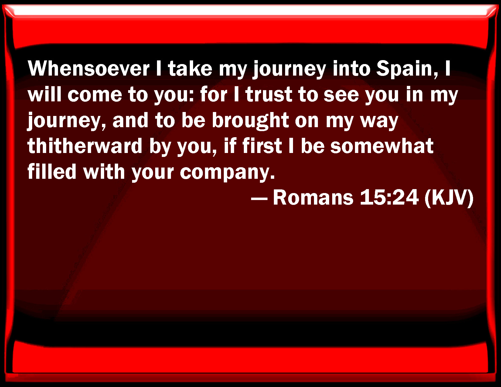 Bible Verse Slide Romans 15:24 Whenever I take my journey into Spain, I will come to you: for I trust to see you in my journey, and to be brought on my way thitherward by you, if first I be somewhat filled with your company. KJV: Whensoever I take my journey into Spain, I will come to you: for I trust to see you in my journey, and to be brought on my way thitherward by you, if first I be somewhat filled with your company. DRB: When I shall begin to take my journey into Spain, I hope that as I pass, I shall see you, and be brought on my way thither by you, if first, in part, I shall have enjoyed you: DBT: whenever I should go to Spain; (for I hope to see you as I go through, and by you to be set forward thither, if first I shall have been in part filled with your company;) ERV: whensoever I go unto Spain (for I hope to see you in my journey, and to be brought on my way thitherward by you, if first in some measure I shall have been satisfied with your company)— WBT: Whenever I take my journey into Spain, I will come to you: for I trust to see you in my journey, and to be brought on my way thitherward by you, if first I shall be somewhat filled with your company. WEB: whenever I journey to Spain, I will come to you. For I hope to see you on my journey, and to be helped on my way there by you, if first I may enjoy your company for a while. YLT: when I may go on to Spain I will come unto you, for I hope in going through, to see you, and by you to be set forward thither, if of you first, in part, I shall be filled.Links Romans 15:24 NIV • Romans 15:24 NLT • Romans 15:24 ESV • Romans 15:24 NASB • Romans 15:24 KJV • Romans 15:24 Interlinear • Romans 15:24 Commentaries • Romans 15:24 Parallel Texts • Romans 15:24 Bible Apps • Romans 15:24 Parallel • Bible Hub |
