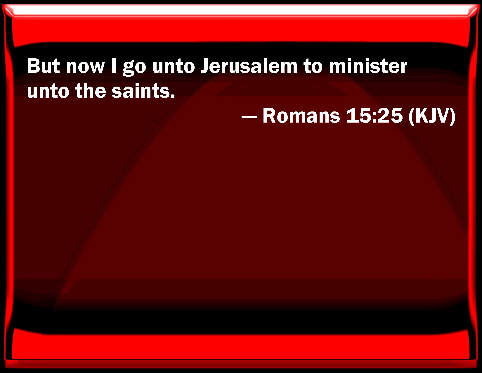 Bible Verse Slide Romans 15:25 But now I go to Jerusalem to minister to the saints. KJV: But now I go unto Jerusalem to minister unto the saints. DRB: But now I shall go to Jerusalem, to minister unto the saints. DBT: but now I go to Jerusalem, ministering to the saints; ERV: but now, I say, I go unto Jerusalem, ministering unto the saints. WBT: But now I go to Jerusalem to minister to the saints. WEB: But now, I say, I am going to Jerusalem, serving the saints. YLT: And, now, I go on to Jerusalem, ministering to the saints;Links Romans 15:25 NIV • Romans 15:25 NLT • Romans 15:25 ESV • Romans 15:25 NASB • Romans 15:25 KJV • Romans 15:25 Interlinear • Romans 15:25 Commentaries • Romans 15:25 Parallel Texts • Romans 15:25 Bible Apps • Romans 15:25 Parallel • Bible Hub |