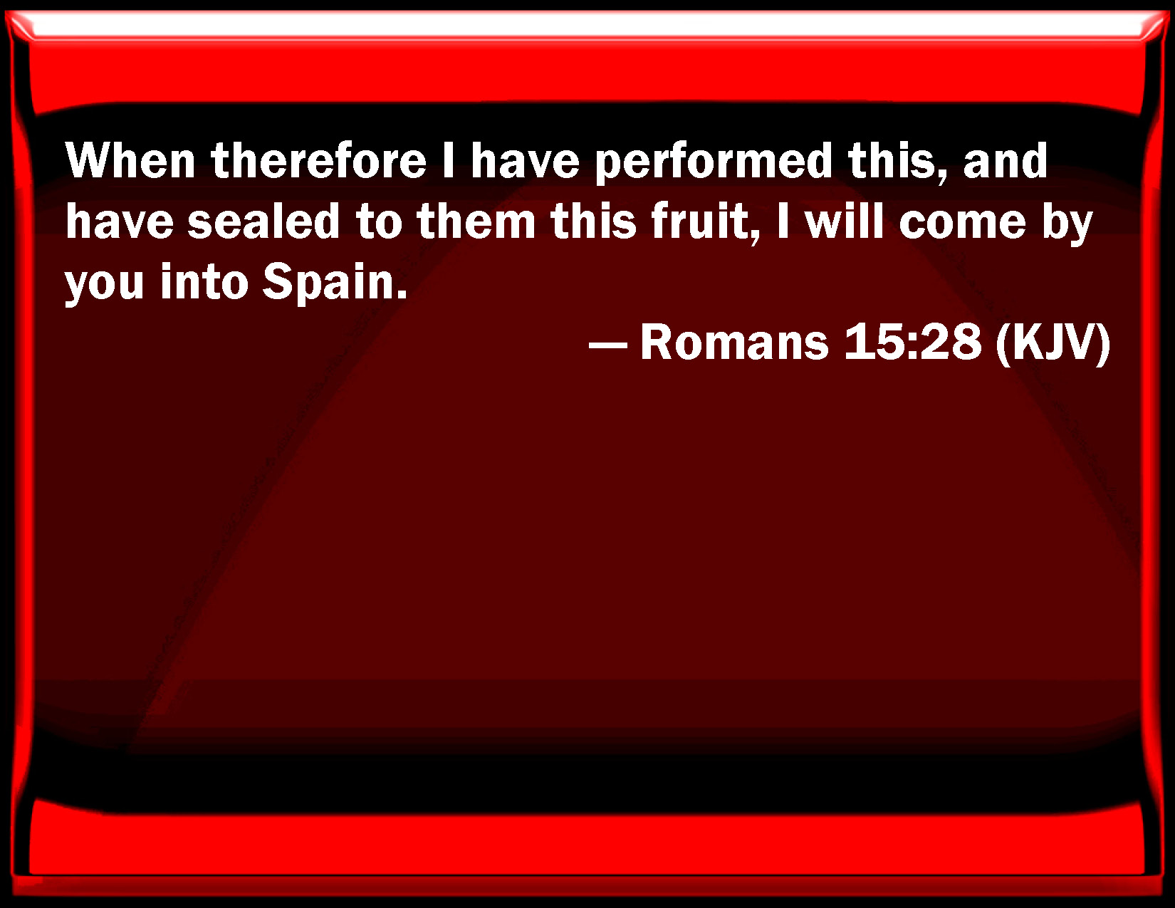 Bible Verse Slide Romans 15:28 When therefore I have performed this, and have sealed to them this fruit, I will come by you into Spain. KJV: When therefore I have performed this, and have sealed to them this fruit, I will come by you into Spain. DRB: When therefore I shall have accomplished this, and consigned to them this fruit, I will come by you into Spain. DBT: Having finished this therefore, and having sealed to them this fruit, I will set off by you into Spain. ERV: When therefore I have accomplished this, and have sealed to them this fruit, I will go on by you unto Spain. WBT: When therefore I have performed this, and have sealed to them this fruit, I will go by you into Spain. WEB: When therefore I have accomplished this, and have sealed to them this fruit, I will go on by way of you to Spain. YLT: This, then, having finished, and having sealed to them this fruit, I will return through you, to Spain;Links Romans 15:28 NIV • Romans 15:28 NLT • Romans 15:28 ESV • Romans 15:28 NASB • Romans 15:28 KJV • Romans 15:28 Interlinear • Romans 15:28 Commentaries • Romans 15:28 Parallel Texts • Romans 15:28 Bible Apps • Romans 15:28 Parallel • Bible Hub |