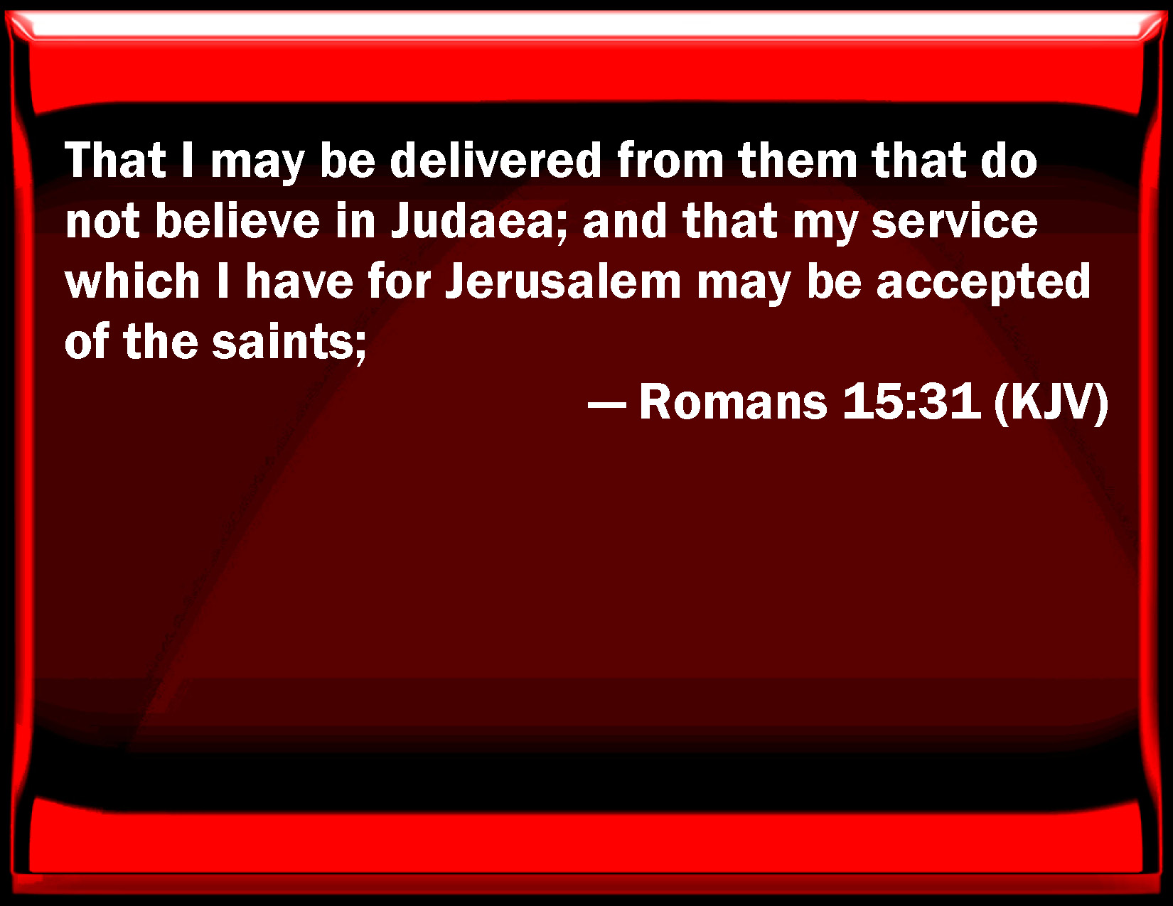 Romans 15:31 That I may be delivered from them that do not believe in Judaea; and that my service which I have for Jerusalem may be accepted of the saints;