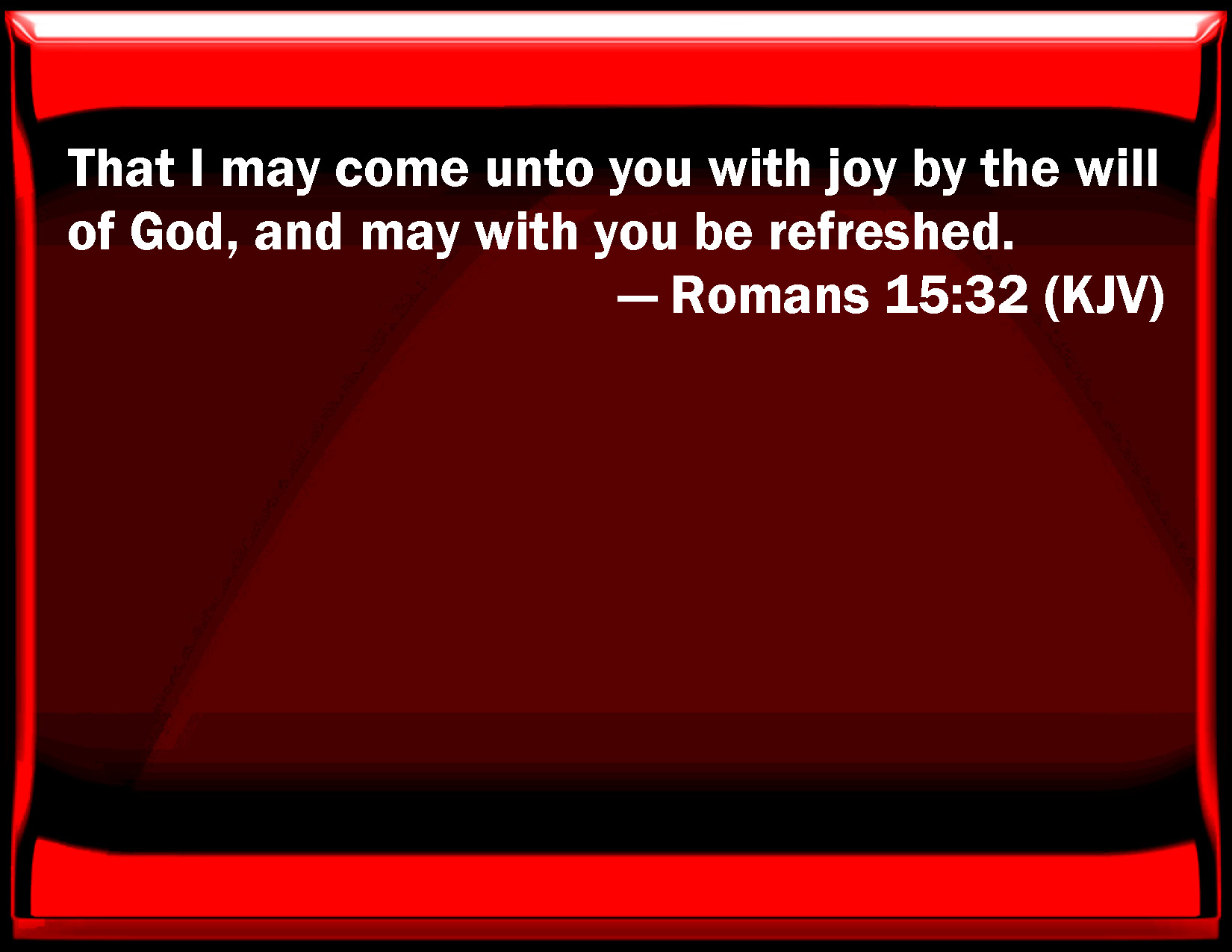 Bible Verse Slide Romans 15:32 That I may come to you with joy by the will of God, and may with you be refreshed. KJV: That I may come unto you with joy by the will of God, and may with you be refreshed. DRB: That I may come to you with joy, by the will of God, and may be refreshed with you. DBT: in order that I may come to you in joy by God's will, and that I may be refreshed with you. ERV: that I may come unto you in joy through the will of God, and together with you find rest. WBT: That I may come to you with joy by the will of God, and may with you be refreshed. WEB: that I may come to you in joy through the will of God, and together with you, find rest. YLT: that in joy I may come unto you, through the will of God, and may be refreshed with you,Links Romans 15:32 NIV • Romans 15:32 NLT • Romans 15:32 ESV • Romans 15:32 NASB • Romans 15:32 KJV • Romans 15:32 Interlinear • Romans 15:32 Commentaries • Romans 15:32 Parallel Texts • Romans 15:32 Bible Apps • Romans 15:32 Parallel • Bible Hub |