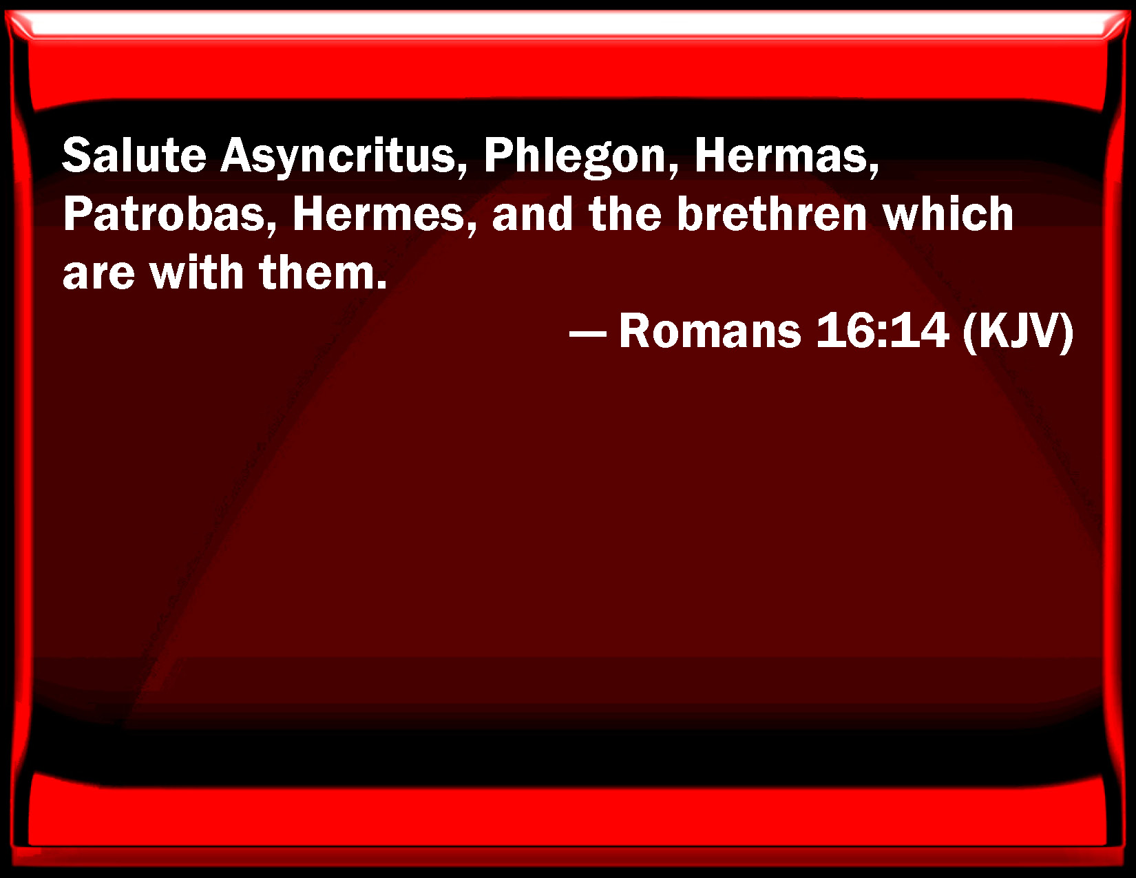 Bible Verse Slide Romans 16:14 Salute Asyncritus, Phlegon, Hermas, Patrobas, Hermes, and the brothers which are with them. KJV: Salute Asyncritus, Phlegon, Hermas, Patrobas, Hermes, and the brethren which are with them. DRB: Salute Asyncritus, Phlegon, Hermas, Patrobas, Hermes, and the brethren that are with them. DBT: Salute Asyncritus, Phlegon, Hermes, Patrobas, Hermas, and the brethren with them. ERV: Salute Asyncritus, Phlegon, Hermes, Patrobas, Hermas, and the brethren that are with them. WBT: Salute Asyncritus, Phlegon, Hermas, Patrobas, Hermes, and the brethren who are with them. WEB: Greet Asyncritus, Phlegon, Hermes, Patrobas, Hermas, and the brothers who are with them. YLT: salute Asyncritus, Phlegon, Hermas, Patrobas, Hermes, and the brethren with them;Links Romans 16:14 NIV • Romans 16:14 NLT • Romans 16:14 ESV • Romans 16:14 NASB • Romans 16:14 KJV • Romans 16:14 Interlinear • Romans 16:14 Commentaries • Romans 16:14 Parallel Texts • Romans 16:14 Bible Apps • Romans 16:14 Parallel • Bible Hub |