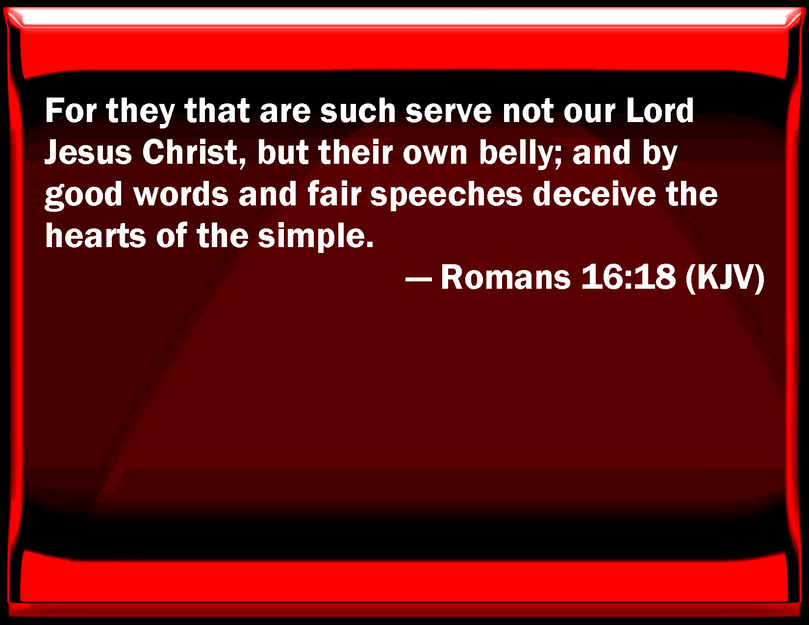Bible Verse Slide Romans 16:18 For they that are such serve not our Lord Jesus Christ, but their own belly; and by good words and fair speeches deceive the hearts of the simple. KJV: For they that are such serve not our Lord Jesus Christ, but their own belly; and by good words and fair speeches deceive the hearts of the simple. DRB: For they that are such, serve not Christ our Lord, but their own belly; and by pleasing speeches and good words, seduce the hearts of the innocent. DBT: For such serve not our Lord Christ, but their own belly, and by good words and fair speeches deceive the hearts of the unsuspecting. ERV: For they that are such serve not our Lord Christ, but their own belly; and by their smooth and fair speech they beguile the hearts of the innocent. WBT: For they that are such serve not our Lord Jesus Christ, but their own belly; and by good words and fair speeches deceive the hearts of the simple. WEB: For those who are such don't serve our Lord, Jesus Christ, but their own belly; and by their smooth and flattering speech, they deceive the hearts of the innocent. YLT: for such our Lord Jesus Christ do not serve, but their own belly; and through the good word and fair speech they deceive the hearts of the harmless,Links Romans 16:18 NIV • Romans 16:18 NLT • Romans 16:18 ESV • Romans 16:18 NASB • Romans 16:18 KJV • Romans 16:18 Interlinear • Romans 16:18 Commentaries • Romans 16:18 Parallel Texts • Romans 16:18 Bible Apps • Romans 16:18 Parallel • Bible Hub |