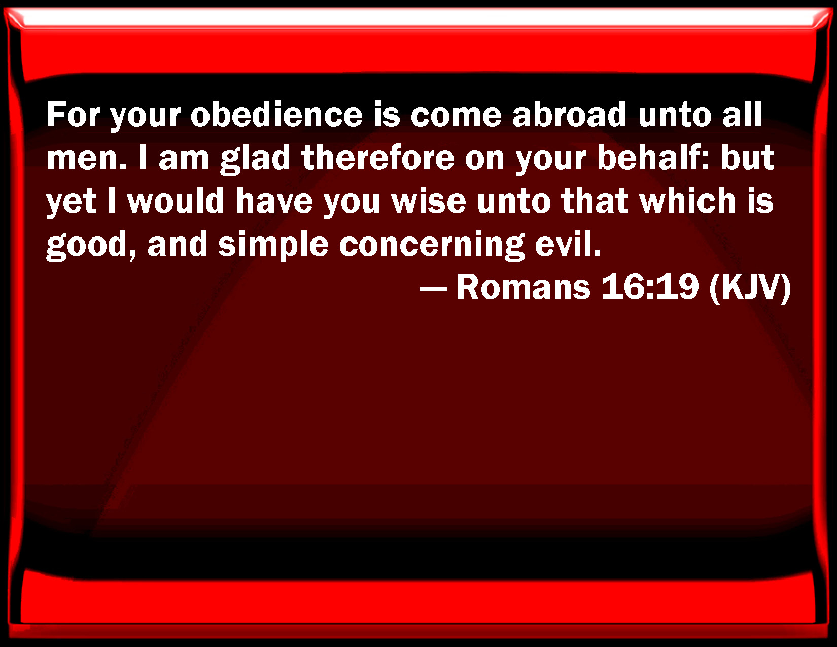 Bible Verse Slide Romans 16:19 For your obedience is come abroad to all men. I am glad therefore on your behalf: but yet I would have you wise to that which is good, and simple concerning evil. KJV: For your obedience is come abroad unto all men. I am glad therefore on your behalf: but yet I would have you wise unto that which is good, and simple concerning evil. DRB: For your obedience is published in every place. I rejoice therefore in you. But I would have you to be wise in good, and simple in evil. DBT: For your obedience has reached to all. I rejoice therefore as it regards you; but I wish you to be wise as to that which is good, and simple as to evil. ERV: For your obedience is come abroad unto all men. I rejoice therefore over you: but I would have you wise unto that which is good, and simple unto that which is evil. WBT: For your obedience is come abroad to all men. I am glad therefore on your behalf: but yet I would have you wise to that which is good, and simple concerning evil. WEB: For your obedience has become known to all. I rejoice therefore over you. But I desire to have you wise in that which is good, but innocent in that which is evil. YLT: for your obedience did reach to all; I rejoice, therefore, as regards you, and I wish you to be wise, indeed, as to the good, and harmless as to the evil;Links Romans 16:19 NIV • Romans 16:19 NLT • Romans 16:19 ESV • Romans 16:19 NASB • Romans 16:19 KJV • Romans 16:19 Interlinear • Romans 16:19 Commentaries • Romans 16:19 Parallel Texts • Romans 16:19 Bible Apps • Romans 16:19 Parallel • Bible Hub |