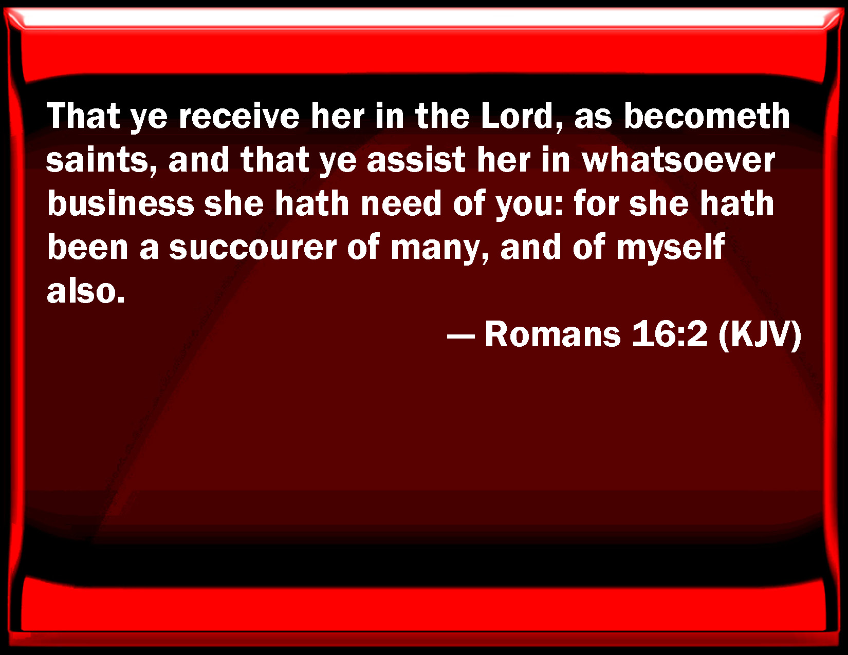Bible Verse Slide Romans 16:2 That you receive her in the Lord, as becomes saints, and that you assist her in whatever business she has need of you: for she has been a succorer of many, and of myself also. KJV: That ye receive her in the Lord, as becometh saints, and that ye assist her in whatsoever business she hath need of you: for she hath been a succourer of many, and of myself also. DRB: That you receive her in the Lord as becometh saints; and that you assist her in whatsoever business she shall have need of you. For she also hath assisted many, and myself also. DBT: that ye may receive her in the Lord worthily of saints, and that ye may assist her in whatever matter she has need of you; for she also has been a helper of many, and of myself. ERV: that ye receive her in the Lord, worthily of the saints, and that ye assist her in whatsoever matter she may have need of you: for she herself also hath been a succourer of many, and of mine own self. WBT: That ye receive her in the Lord, as it becometh saints, and that ye assist her in whatever business she hath need of you: for she hath been a succorer of many, and of myself also. WEB: that you receive her in the Lord, in a way worthy of the saints, and that you assist her in whatever matter she may need from you, for she herself also has been a helper of many, and of my own self. YLT: that ye may receive her in the Lord, as doth become saints, and may assist her in whatever matter she may have need of you — for she also became a leader of many, and of myself.Links Romans 16:2 NIV • Romans 16:2 NLT • Romans 16:2 ESV • Romans 16:2 NASB • Romans 16:2 KJV • Romans 16:2 Interlinear • Romans 16:2 Commentaries • Romans 16:2 Parallel Texts • Romans 16:2 Bible Apps • Romans 16:2 Parallel • Bible Hub |