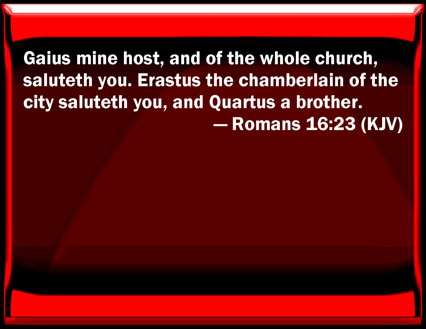 Bible Verse Slide Romans 16:23 Gaius my host, and of the whole church, salutes you. Erastus the chamberlain of the city salutes you, and Quartus a brother. KJV: Gaius mine host, and of the whole church, saluteth you. Erastus the chamberlain of the city saluteth you, and Quartus a brother. DRB: Caius, my host, and the whole church, saluteth you. Erastus, the treasurer of the city, saluteth you, and Quartus, a brother. DBT: Gaius, my host and of the whole assembly, salutes you. Erastus, the steward of the city, salutes you, and the brother Quartus. ERV: Gaius my host, and of the whole church, saluteth you. Erastus the treasurer of the city saluteth you, and Quartus the brother. WBT: Gaius my host, and of the whole church, saluteth you. Erastus the chamberlain of the city saluteth you, and Quartus a brother. WEB: Gaius, my host and host of the whole assembly, greets you. Erastus, the treasurer of the city, greets you, as does Quartus, the brother. YLT: salute you doth Gaius, my host, and of the whole assembly; salute you doth Erastus, the steward of the city, and Quartus the brother,Links Romans 16:23 NIV • Romans 16:23 NLT • Romans 16:23 ESV • Romans 16:23 NASB • Romans 16:23 KJV • Romans 16:23 Interlinear • Romans 16:23 Commentaries • Romans 16:23 Parallel Texts • Romans 16:23 Bible Apps • Romans 16:23 Parallel • Bible Hub |