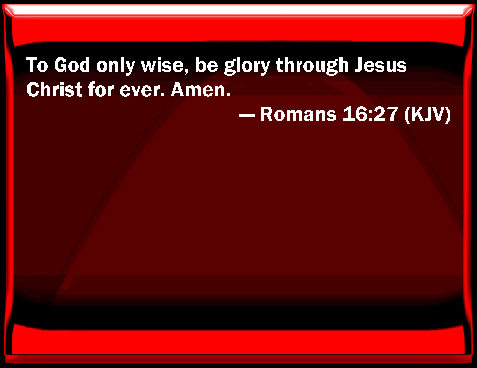 Bible Verse Slide Romans 16:27 To God only wise, be glory through Jesus Christ for ever. Amen. KJV: To God only wise, be glory through Jesus Christ for ever. Amen. DRB: To God the only wise, through Jesus Christ, to whom be honour and glory for ever and ever. Amen. DBT: the only wise God, through Jesus Christ, to whom be glory for ever. Amen. ERV: to the only wise God, through Jesus Christ, to whom be the glory for ever. Amen. WBT: To God the only wise, be glory through Jesus Christ for ever. Amen. WEB: (14:26) to the only wise God, through Jesus Christ, to whom be the glory forever! Amen. YLT: to the only wise God, through Jesus Christ, to him be glory to the ages. Amen.Links Romans 16:27 NIV • Romans 16:27 NLT • Romans 16:27 ESV • Romans 16:27 NASB • Romans 16:27 KJV • Romans 16:27 Interlinear • Romans 16:27 Commentaries • Romans 16:27 Parallel Texts • Romans 16:27 Bible Apps • Romans 16:27 Parallel • Bible Hub |