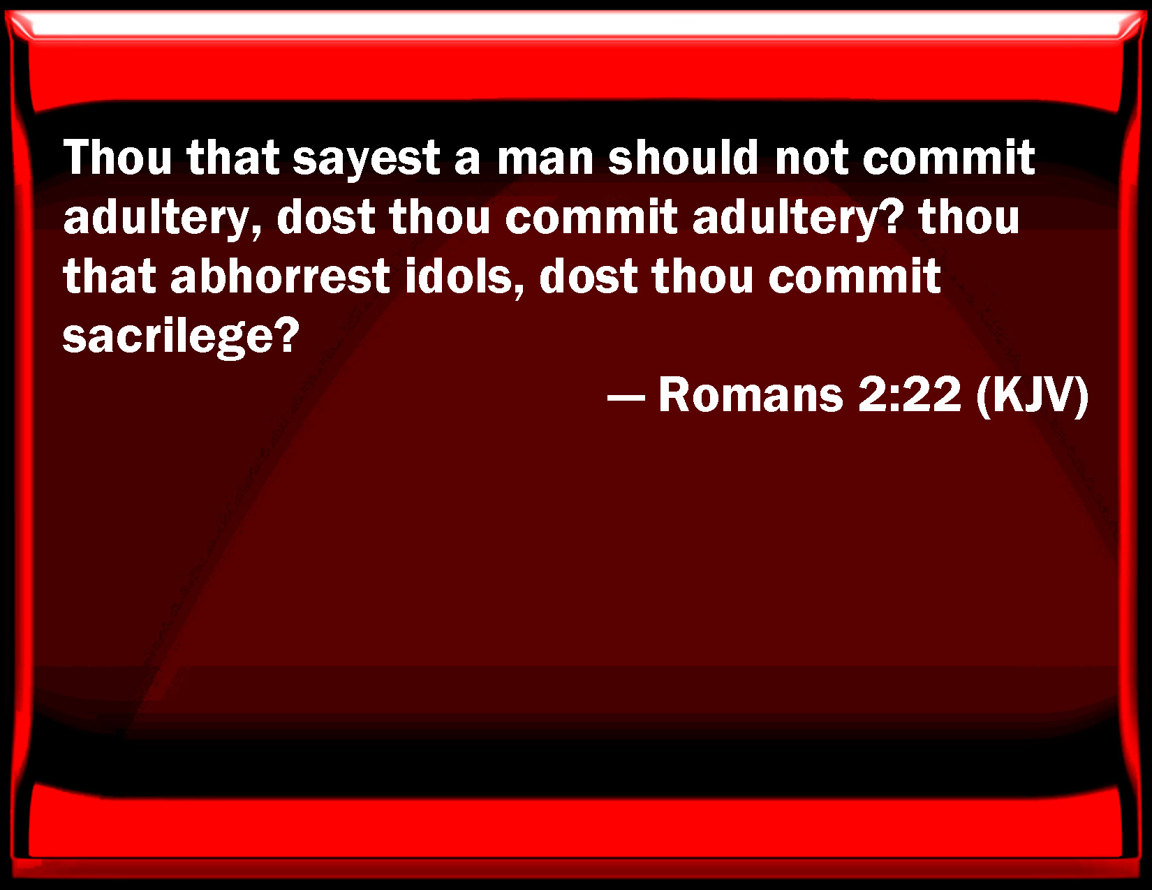 Bible Verse Slide Romans 2:22 You that say a man should not commit adultery, do you commit adultery? you that abhor idols, do you commit sacrilege? KJV: Thou that sayest a man should not commit adultery, dost thou commit adultery? thou that abhorrest idols, dost thou commit sacrilege? DRB: Thou that sayest, men should not commit adultery, committest adultery: thou that abhorrest idols, committest sacrilege: DBT: thou that sayest man should not commit adultery, dost thou commit adultery? thou that abhorrest idols, dost thou commit sacrilege? ERV: thou that sayest a man should not commit adultery, dost thou commit adultery? thou that abhorrest idols, dost thou rob temples? WBT: Thou that sayest a man should not commit adultery, dost thou commit adultery? thou that abhorrest idols, dost thou commit sacrilege? WEB: You who say a man shouldn't commit adultery. Do you commit adultery? You who abhor idols, do you rob temples? YLT: thou who art preaching not to steal, dost thou steal? thou who art saying not to commit adultery, dost thou commit adultery? thou who art abhorring the idols, dost thou rob temples?Links Romans 2:22 NIV • Romans 2:22 NLT • Romans 2:22 ESV • Romans 2:22 NASB • Romans 2:22 KJV • Romans 2:22 Interlinear • Romans 2:22 Commentaries • Romans 2:22 Parallel Texts • Romans 2:22 Bible Apps • Romans 2:22 Parallel • Bible Hub |
