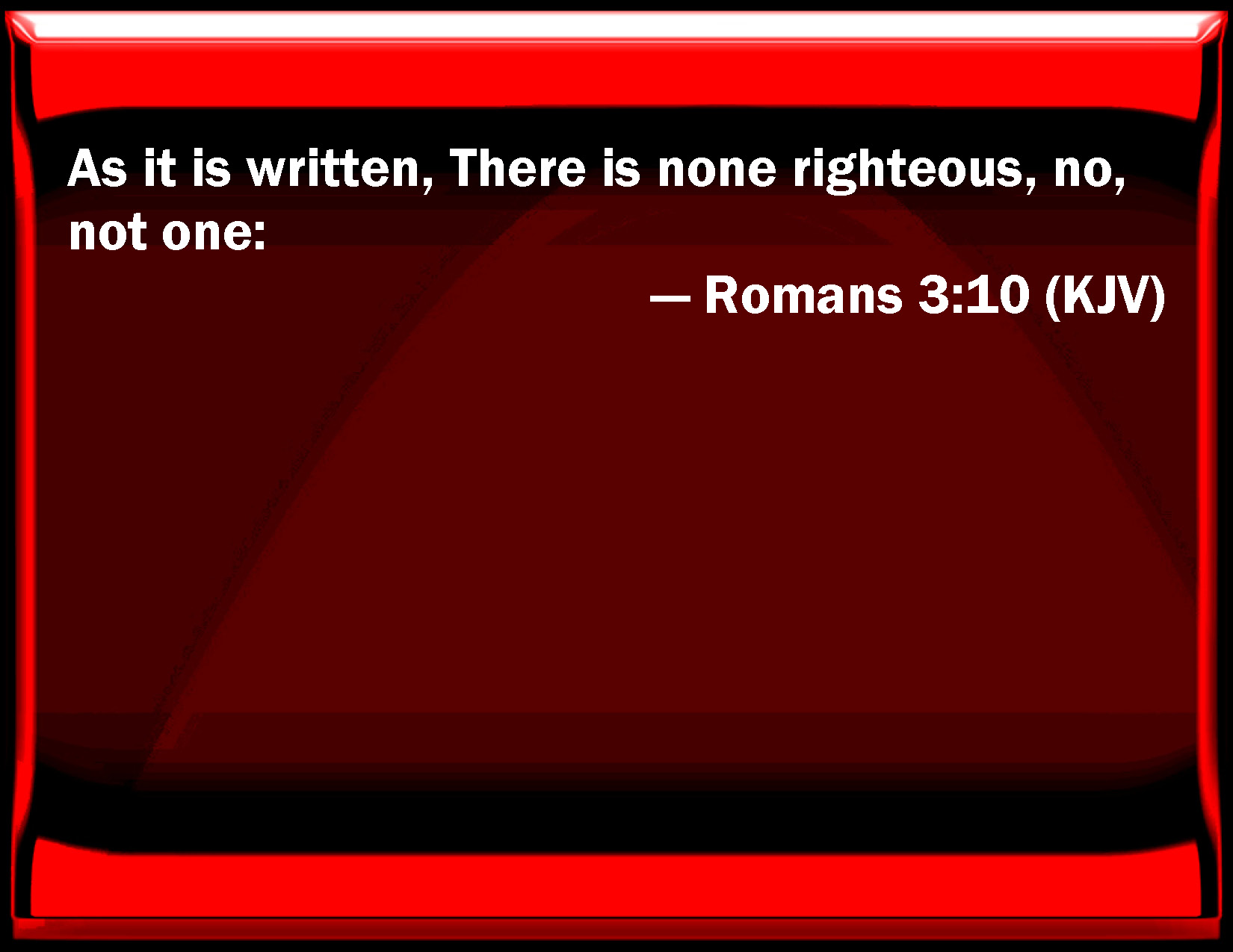Bible Verse Slide Romans 3:10 As it is written, There is none righteous, no, not one: KJV: As it is written, There is none righteous, no, not one: DRB: As it is written: There is not any man just. DBT: according as it is written, There is not a righteous man, not even one; ERV: as it is written, There is none righteous, no, not one; WBT: As it is written, There is none righteous, no, not one: WEB: As it is written, "There is no one righteous; no, not one. YLT: according as it hath been written — 'There is none righteous, not even one;Links Romans 3:10 NIV • Romans 3:10 NLT • Romans 3:10 ESV • Romans 3:10 NASB • Romans 3:10 KJV • Romans 3:10 Interlinear • Romans 3:10 Commentaries • Romans 3:10 Parallel Texts • Romans 3:10 Bible Apps • Romans 3:10 Parallel • Bible Hub |