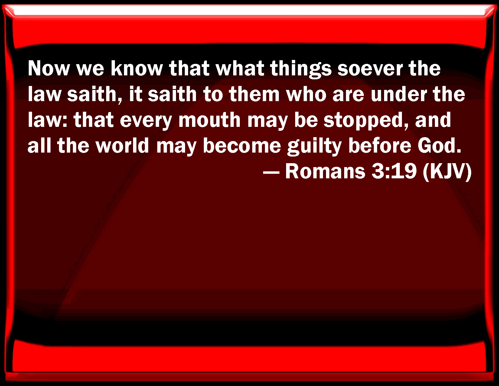 Bible Verse Slide Romans 3:19 Now we know that what things soever the law said, it said to them who are under the law: that every mouth may be stopped, and all the world may become guilty before God. KJV: Now we know that what things soever the law saith, it saith to them who are under the law: that every mouth may be stopped, and all the world may become guilty before God. DRB: Now we know, that what things soever the law speaketh, it speaketh to them that are in the law; that every mouth may be stopped, and all the world may be made subject to God. DBT: Now we know that whatever the things the law says, it speaks to those under the law, that every mouth may be stopped, and all the world be under judgment to God. ERV: Now we know that what things soever the law saith, it speaketh to them that are under the law; that every mouth may be stopped, and all the world may be brought under the judgment of God: WBT: Now we know that whatever things the law saith, it saith to them who are under the law: that every mouth may be stopped, and all the world may become guilty before God. WEB: Now we know that whatever things the law says, it speaks to those who are under the law, that every mouth may be closed, and all the world may be brought under the judgment of God. YLT: And we have known that as many things as the law saith, to those in the law it doth speak, that every mouth may be stopped, and all the world may come under judgment to God;Links Romans 3:19 NIV • Romans 3:19 NLT • Romans 3:19 ESV • Romans 3:19 NASB • Romans 3:19 KJV • Romans 3:19 Interlinear • Romans 3:19 Commentaries • Romans 3:19 Parallel Texts • Romans 3:19 Bible Apps • Romans 3:19 Parallel • Bible Hub |