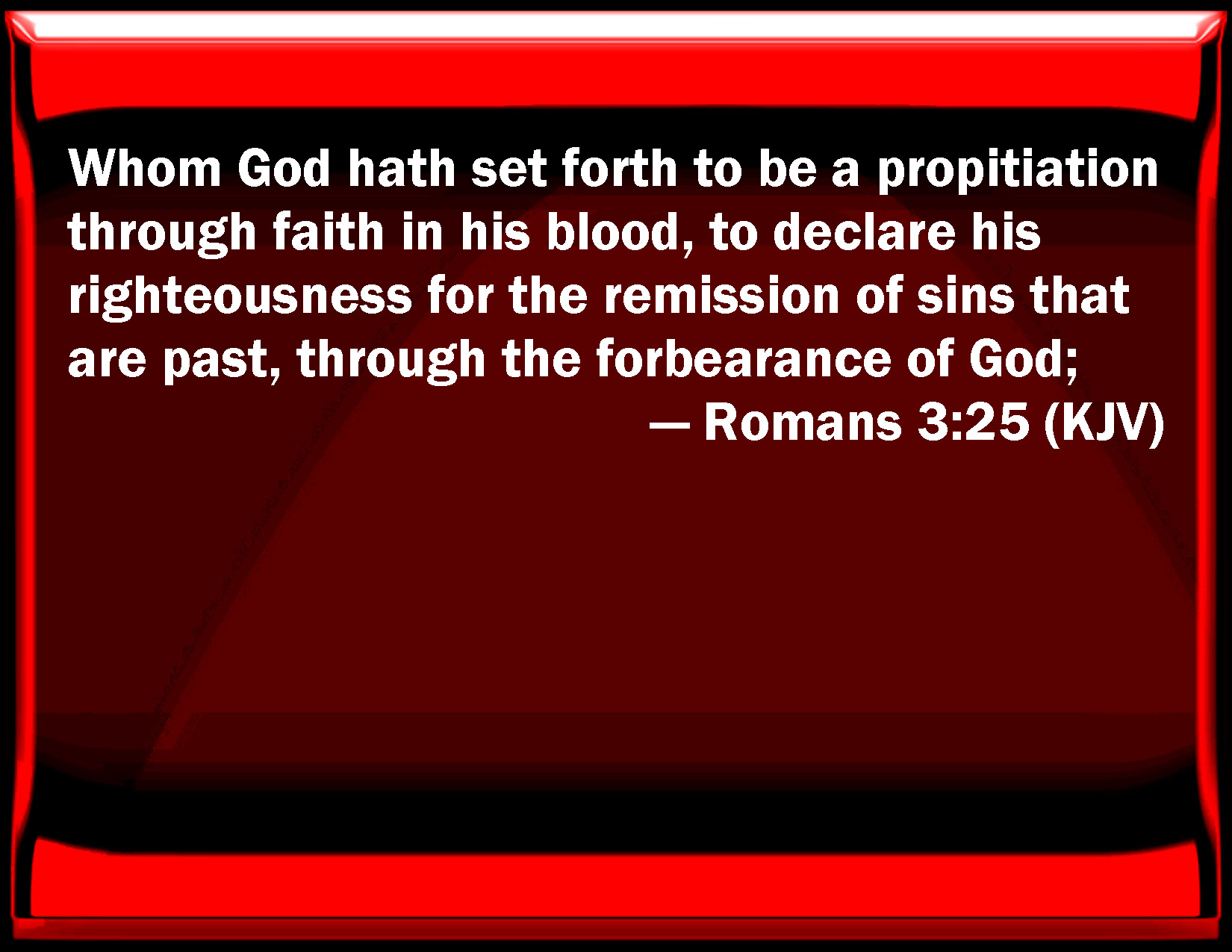 Bible Verse Slide Romans 3:25 Whom God has set forth to be a propitiation through faith in his blood, to declare his righteousness for the remission of sins that are past, through the forbearance of God; KJV: Whom God hath set forth to be a propitiation through faith in his blood, to declare his righteousness for the remission of sins that are past, through the forbearance of God; DRB: Whom God hath proposed to be a propitiation, through faith in his blood, to the shewing of his justice, for the remission of former sins, DBT: whom God has set forth a mercy-seat, through faith in his blood, for the shewing forth of his righteousness, in respect of the passing by the sins that had taken place before, through the forbearance of God; ERV: whom God set forth to be a propitiation, through faith, by his blood, to shew his righteousness, because of the passing over of the sins done aforetime, in the forbearance of God; WBT: Whom God hath set forth to be a propitiation, through faith in his blood, to declare his righteousness for the remission of sins that are past, through the forbearance of God; WEB: whom God set forth to be an atoning sacrifice, through faith in his blood, for a demonstration of his righteousness through the passing over of prior sins, in God's forbearance; YLT: whom God did set forth a mercy seat, through the faith in his blood, for the shewing forth of His righteousness, because of the passing over of the bygone sins in the forbearance of God — Links Romans 3:25 NIV • Romans 3:25 NLT • Romans 3:25 ESV • Romans 3:25 NASB • Romans 3:25 KJV • Romans 3:25 Interlinear • Romans 3:25 Commentaries • Romans 3:25 Parallel Texts • Romans 3:25 Bible Apps • Romans 3:25 Parallel • Bible Hub |