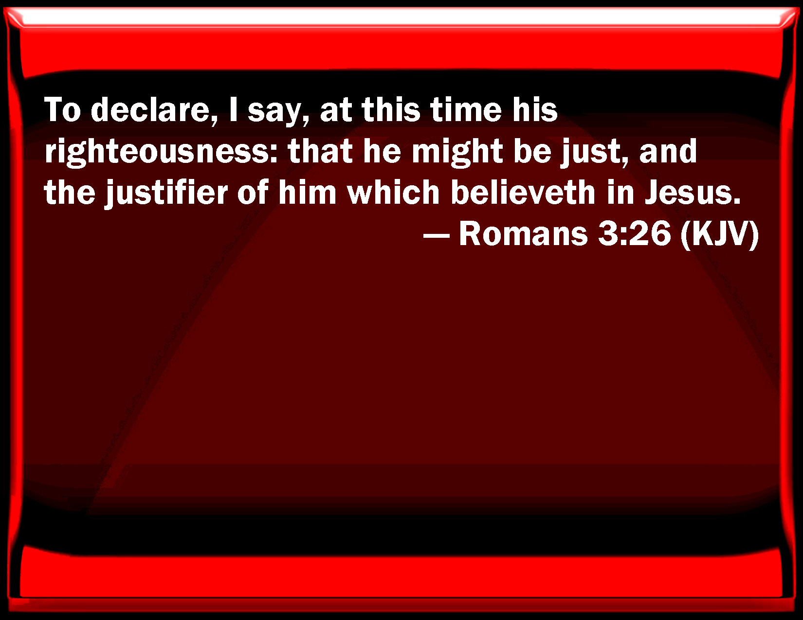 Bible Verse Slide Romans 3:26 To declare, I say, at this time his righteousness: that he might be just, and the justifier of him which believes in Jesus. KJV: To declare, I say, at this time his righteousness: that he might be just, and the justifier of him which believeth in Jesus. DRB: Through the forbearance of God, for the shewing of his justice in this time; that he himself may be just, and the justifier of him, who is of the faith of Jesus Christ. DBT: for the shewing forth of his righteousness in the present time, so that he should be just, and justify him that is of the faith of Jesus. ERV: for the shewing, I say, of his righteousness at this present season: that he might himself be just, and the justifier of him that hath faith in Jesus. WBT: To declare, I say, at this time his righteousness: that he may be just, and the justifier of him who believeth in Jesus. WEB: to demonstrate his righteousness at this present time; that he might himself be just, and the justifier of him who has faith in Jesus. YLT: for the shewing forth of His righteousness in the present time, for His being righteous, and declaring him righteous who is of the faith of Jesus.Links Romans 3:26 NIV • Romans 3:26 NLT • Romans 3:26 ESV • Romans 3:26 NASB • Romans 3:26 KJV • Romans 3:26 Interlinear • Romans 3:26 Commentaries • Romans 3:26 Parallel Texts • Romans 3:26 Bible Apps • Romans 3:26 Parallel • Bible Hub |