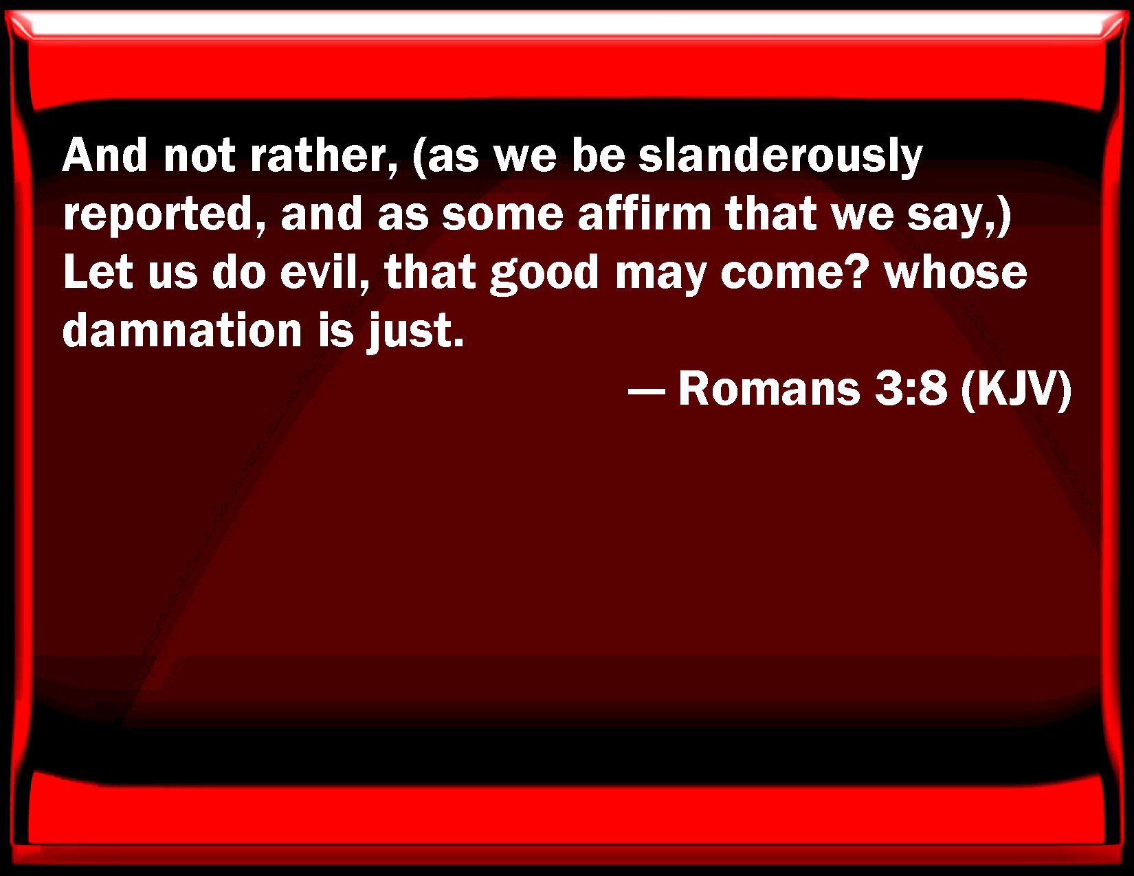 Bible Verse Slide Romans 3:8 And not rather, (as we be slanderously reported, and as some affirm that we say,) Let us do evil, that good may come? whose damnation is just. KJV: And not rather, (as we be slanderously reported, and as some affirm that we say,) Let us do evil, that good may come? whose damnation is just. DRB: And not rather (as we are slandered, and as some affirm that we say) let us do evil, that there may come good? whose damnation is just. DBT: and not, according as we are injuriously charged, and according as some affirm that we say, Let us practise evil things, that good ones may come? whose judgment is just. ERV: and why not (as we be slanderously reported, and as some affirm that we say), Let us do evil, that good may come? whose condemnation is just. WBT: And not rather (as we are slanderously reported, and as some affirm that we say) Let us do evil, that good may come? whose damnation is just. WEB: Why not (as we are slanderously reported, and as some affirm that we say), "Let us do evil, that good may come?" Those who say so are justly condemned. YLT: and not, as we are evil spoken of, and as certain affirm us to say — 'We may do the evil things, that the good ones may come?' whose judgment is righteous.Links Romans 3:8 NIV • Romans 3:8 NLT • Romans 3:8 ESV • Romans 3:8 NASB • Romans 3:8 KJV • Romans 3:8 Interlinear • Romans 3:8 Commentaries • Romans 3:8 Parallel Texts • Romans 3:8 Bible Apps • Romans 3:8 Parallel • Bible Hub |