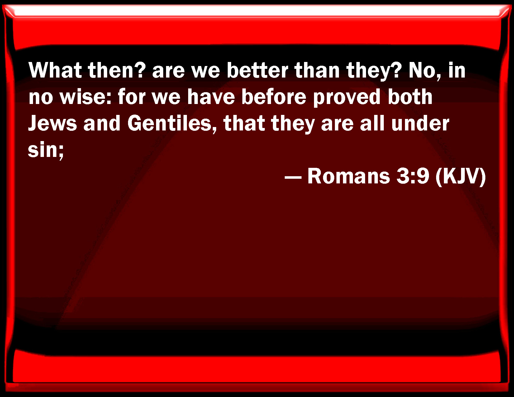 Bible Verse Slide Romans 3:9 What then? are we better than they? No, in no wise: for we have before proved both Jews and Gentiles, that they are all under sin; KJV: What then? are we better than they? No, in no wise: for we have before proved both Jews and Gentiles, that they are all under sin; DRB: What then? Do we excel them? No, not so. For we have charged both Jews, and Greeks, that they are all under sin. DBT: What then? are we better? No, in no wise: for we have before charged both Jews and Greeks with being all under sin: ERV: What then? are we in worse case than they? No, in no wise: for we before laid to the charge both of Jews and Greeks, that they are all under sin; WBT: What then? are we better than they? No, in no wise: for we have before proved both Jews and Gentiles, that they are all under sin; WEB: What then? Are we better than they? No, in no way. For we previously warned both Jews and Greeks, that they are all under sin. YLT: What, then? are we better? not at all! for we did before charge both Jews and Greeks with being all under sin,Links Romans 3:9 NIV • Romans 3:9 NLT • Romans 3:9 ESV • Romans 3:9 NASB • Romans 3:9 KJV • Romans 3:9 Interlinear • Romans 3:9 Commentaries • Romans 3:9 Parallel Texts • Romans 3:9 Bible Apps • Romans 3:9 Parallel • Bible Hub |