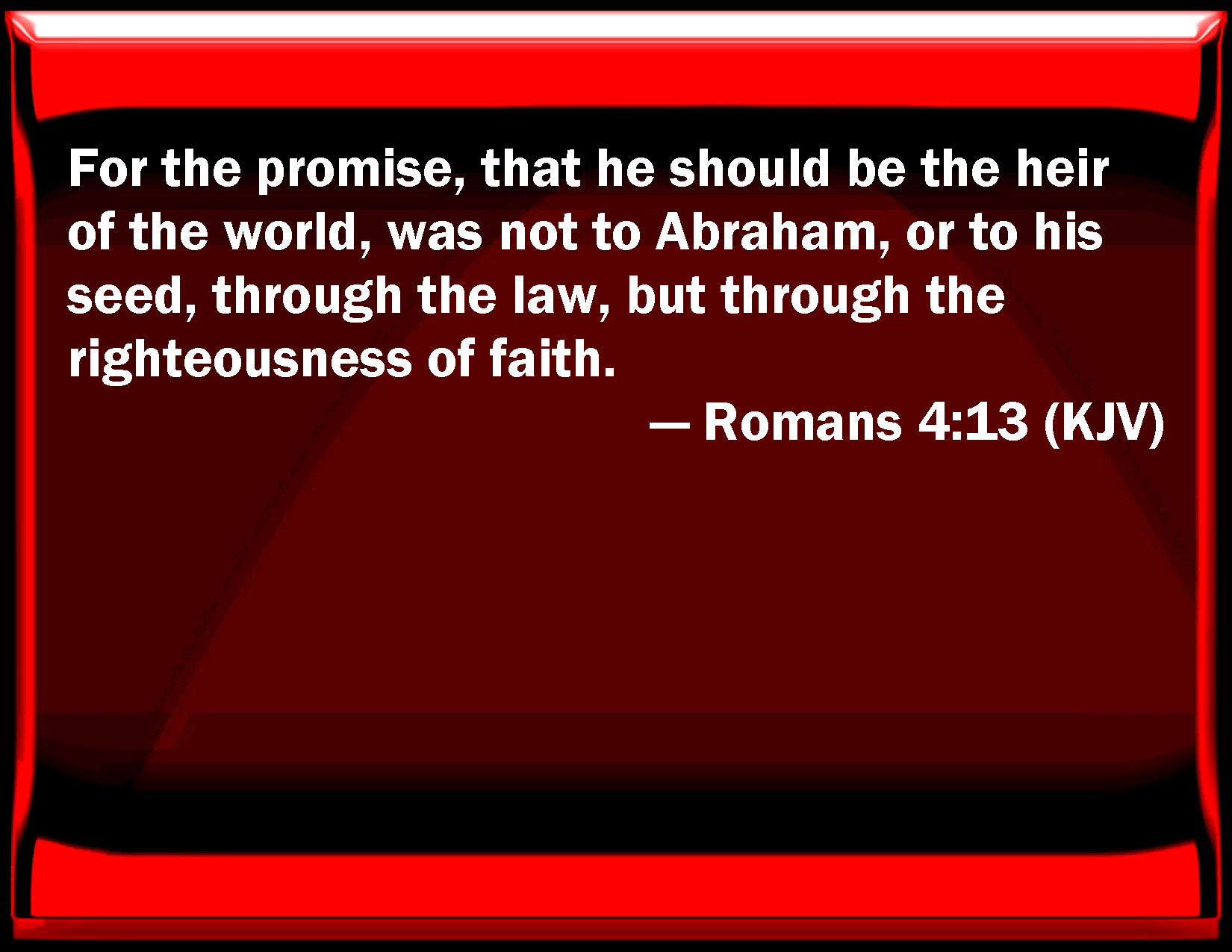 Bible Verse Slide Romans 4:13 For the promise, that he should be the heir of the world, was not to Abraham, or to his seed, through the law, but through the righteousness of faith. KJV: For the promise, that he should be the heir of the world, was not to Abraham, or to his seed, through the law, but through the righteousness of faith. DRB: For not through the law was the promise to Abraham, or to his seed, that he should be heir of the world; but through the justice of faith. DBT: For it was not by law that the promise was to Abraham, or to his seed, that he should be heir of the world, but by righteousness of faith. ERV: For not through the law was the promise to Abraham or to his seed, that he should be heir of the world, but through the righteousness of faith. WBT: For the promise that he should be the heir of the world was not to Abraham, or to his seed, through the law, but through the righteousness of faith. WEB: For the promise to Abraham and to his seed that he should be heir of the world wasn't through the law, but through the righteousness of faith. YLT: For not through law is the promise to Abraham, or to his seed, of his being heir of the world, but through the righteousness of faith;Links Romans 4:13 NIV • Romans 4:13 NLT • Romans 4:13 ESV • Romans 4:13 NASB • Romans 4:13 KJV • Romans 4:13 Interlinear • Romans 4:13 Commentaries • Romans 4:13 Parallel Texts • Romans 4:13 Bible Apps • Romans 4:13 Parallel • Bible Hub |