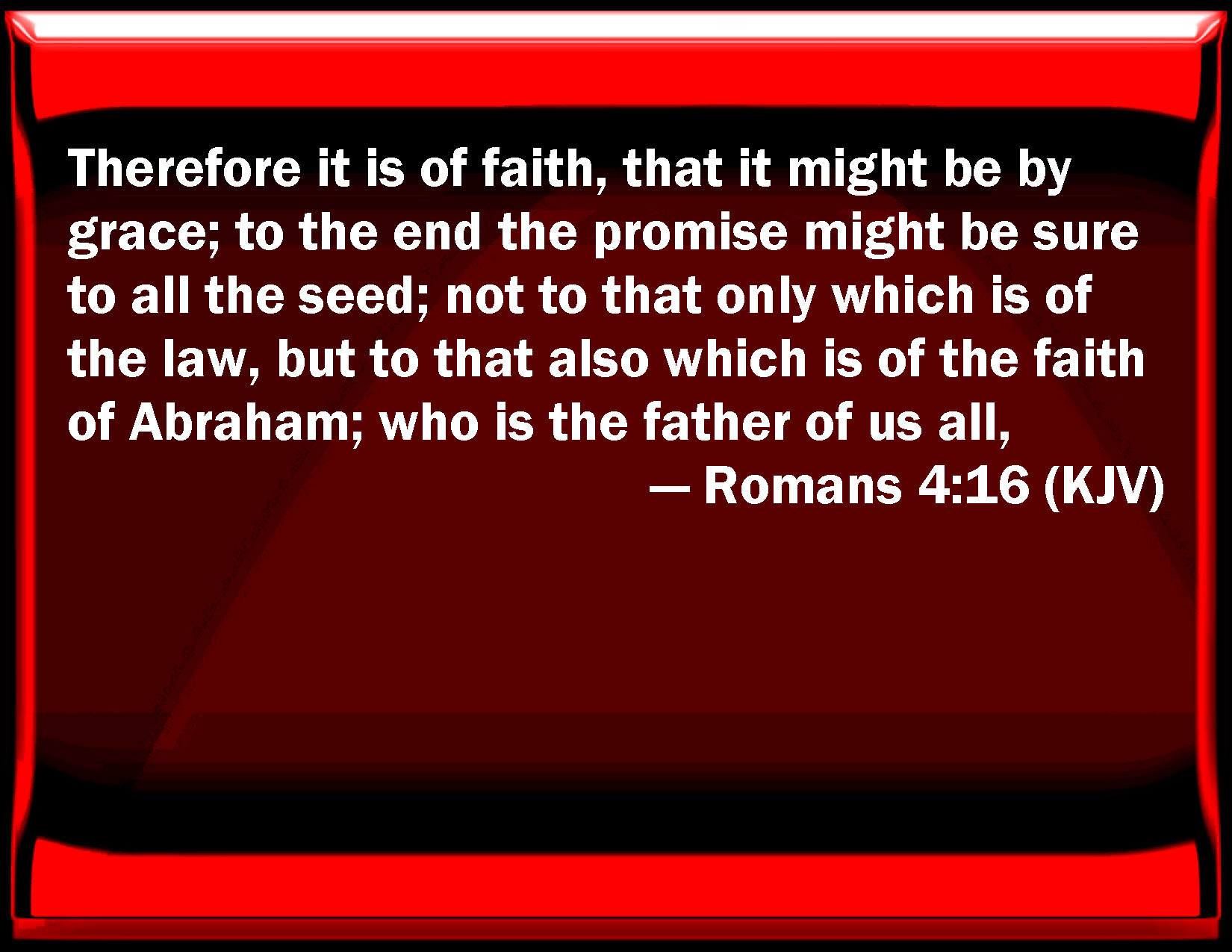 Bible Verse Slide Romans 4:16 Therefore it is of faith, that it might be by grace; to the end the promise might be sure to all the seed; not to that only which is of the law, but to that also which is of the faith of Abraham; who is the father of us all, KJV: Therefore it is of faith, that it might be by grace; to the end the promise might be sure to all the seed; not to that only which is of the law, but to that also which is of the faith of Abraham; who is the father of us all, DRB: Therefore is it of faith, that according to grace the promise might be firm to all the seed; not to that only which is of the law, but to that also which is of the faith of Abraham, who is the father of us all, DBT: Therefore it is on the principle of faith, that it might be according to grace, in order to the promise being sure to all the seed, not to that only which is of the law, but to that also which is of Abraham's faith, who is father of us all, ERV: For this cause it is of faith, that it may be according to grace; to the end that the promise may be sure to all the seed; not to that only which is of the law, but to that also which is of the faith of Abraham, who is the father of us all WBT: Therefore it is of faith, that it might be by grace; to the end the promise might be sure to all the seed, not to that only which is of the law, but to that also which is of the faith of Abraham, who is the father of us all; WEB: For this cause it is of faith, that it may be according to grace, to the end that the promise may be sure to all the seed, not to that only which is of the law, but to that also which is of the faith of Abraham, who is the father of us all. YLT: Because of this it is of faith, that it may be according to grace, for the promise being sure to all the seed, not to that which is of the law only, but also to that which is of the faith of Abraham,Links Romans 4:16 NIV • Romans 4:16 NLT • Romans 4:16 ESV • Romans 4:16 NASB • Romans 4:16 KJV • Romans 4:16 Interlinear • Romans 4:16 Commentaries • Romans 4:16 Parallel Texts • Romans 4:16 Bible Apps • Romans 4:16 Parallel • Bible Hub |
