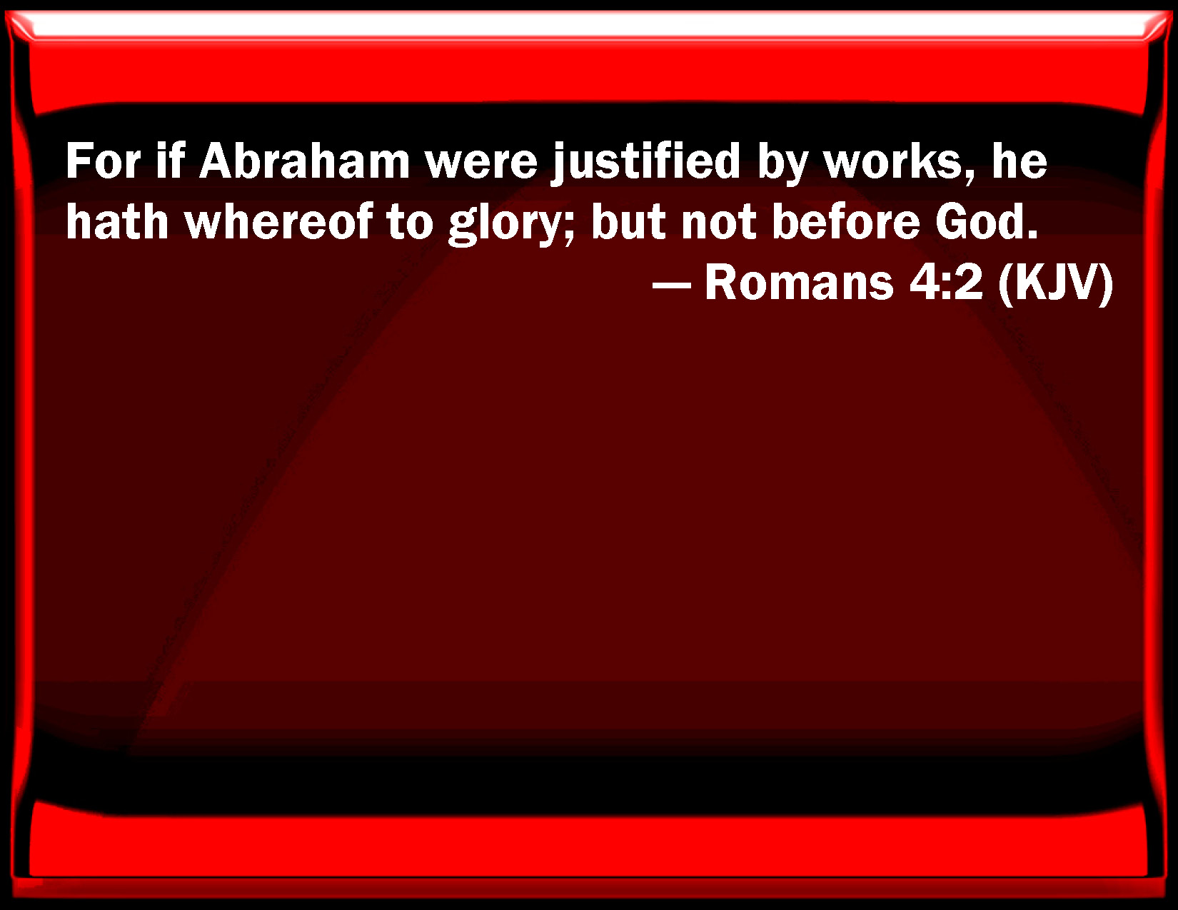 Bible Verse Slide Romans 4:2 For if Abraham were justified by works, he has whereof to glory; but not before God. KJV: For if Abraham were justified by works, he hath whereof to glory; but not before God. DRB: For if Abraham were justified by works, he hath whereof to glory, but not before God. DBT: For if Abraham has been justified on the principle of works, he has whereof to boast: but not before God; ERV: For if Abraham was justified by works, he hath whereof to glory; but not toward God. WBT: For if Abraham were justified by works, he hath whereof to glory, but not before God. WEB: For if Abraham was justified by works, he has something to boast about, but not toward God. YLT: for if Abraham by works was declared righteous, he hath to boast — but not before God;Links Romans 4:2 NIV • Romans 4:2 NLT • Romans 4:2 ESV • Romans 4:2 NASB • Romans 4:2 KJV • Romans 4:2 Interlinear • Romans 4:2 Commentaries • Romans 4:2 Parallel Texts • Romans 4:2 Bible Apps • Romans 4:2 Parallel • Bible Hub |